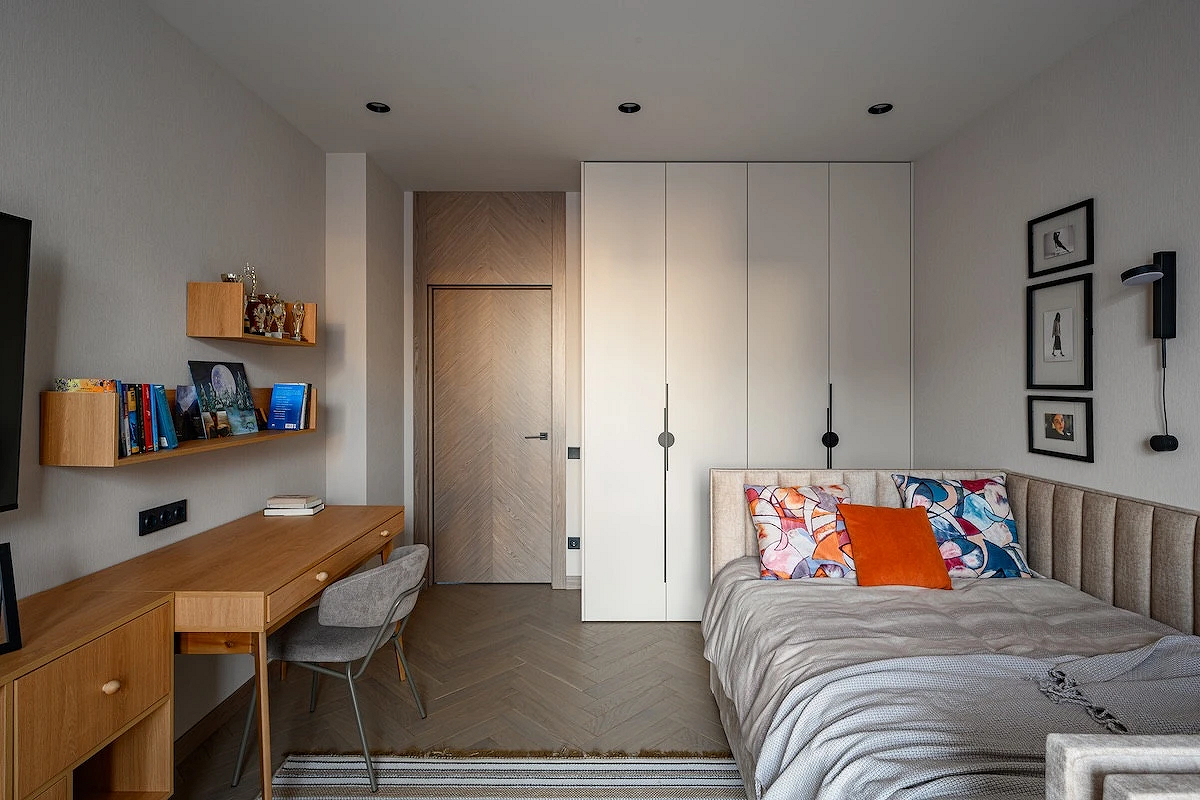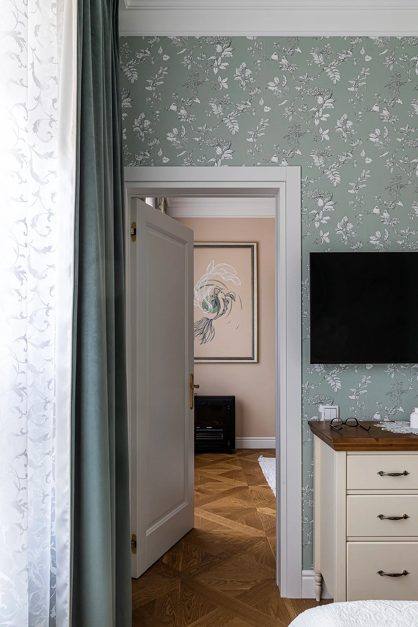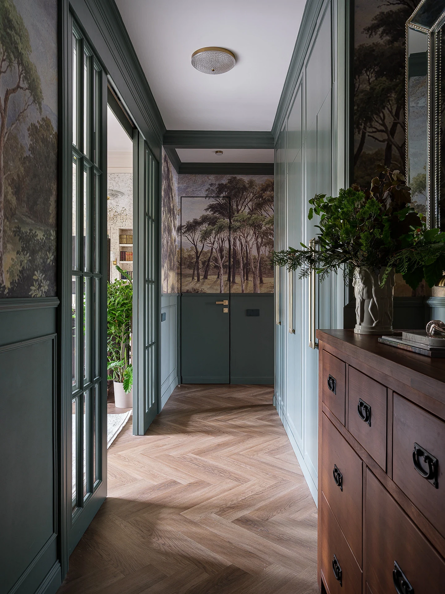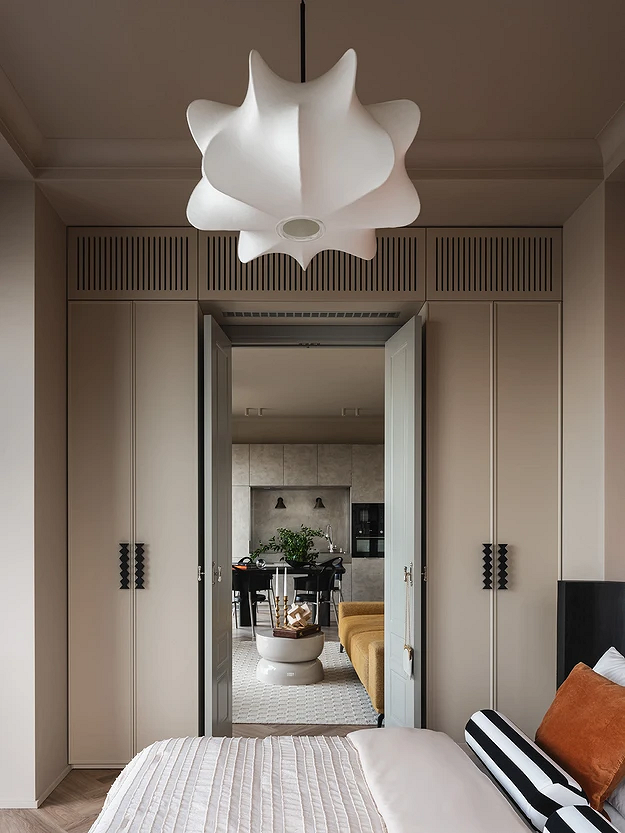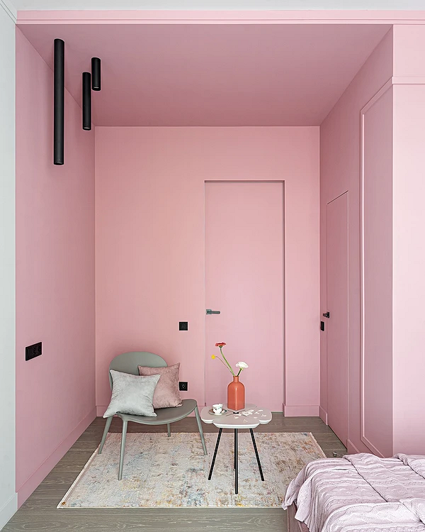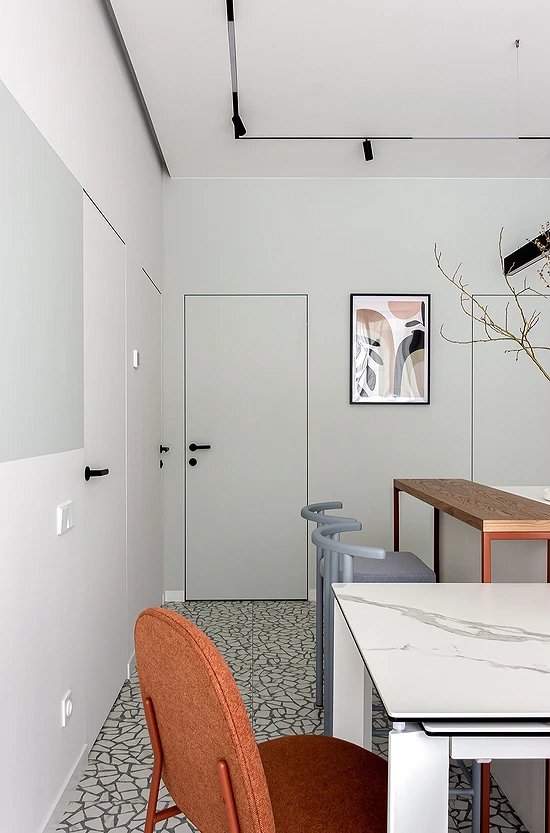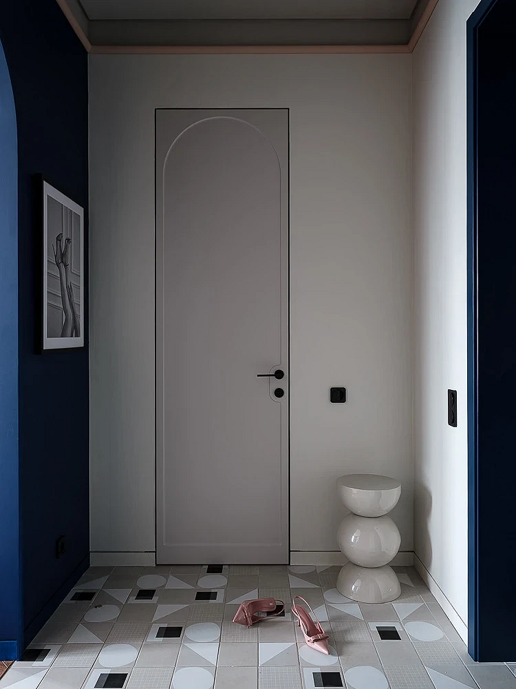 Двери, окрашенные в цвет стен, — один из самых практичных и универсальных трендов. Полотна не выделяются, не дробят поверхность на фрагменты и делают интерьер более цельным. Решение особенно актуально для небольших пространств и длинных узких коридоров.