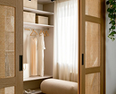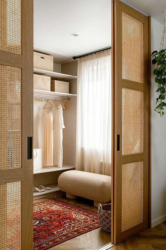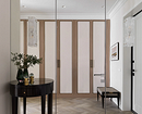 - Складные — используются там, где важно максимально сократить место, которое занимает дверь. Полотно складывается «книжкой» или «гармошкой», что удобно для гардеробных, кладовых и других маленьких помещений. По прочности и шумоизоляции такие двери уступают классическим вариантам.