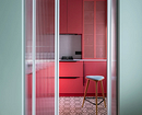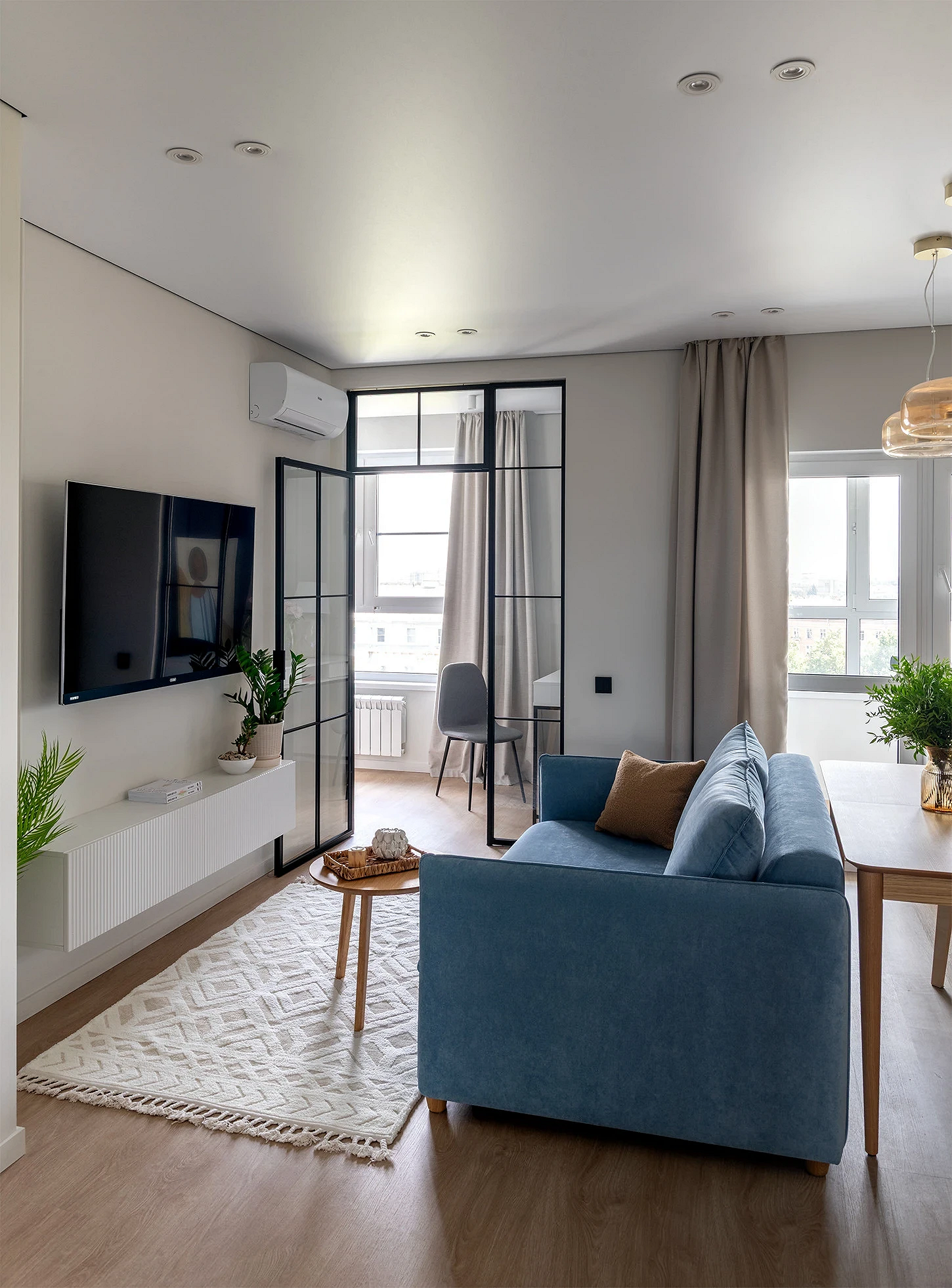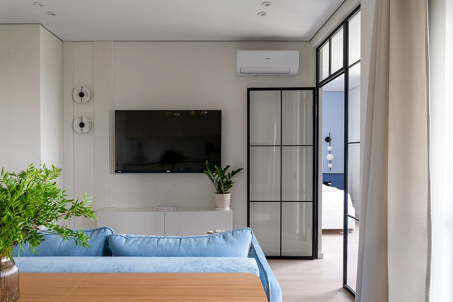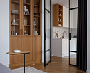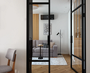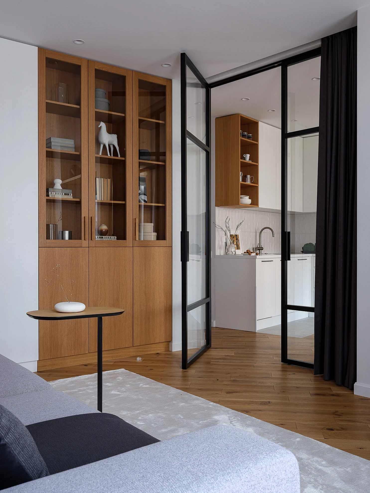 Такие двери устанавливают между кухней и гостиной или гостиной и спальней, в домашних кабинетах, гардеробных и студиях. Каркас и профиль должны быть лаконичными, чтобы стекло оставалось главным действующим элементом.