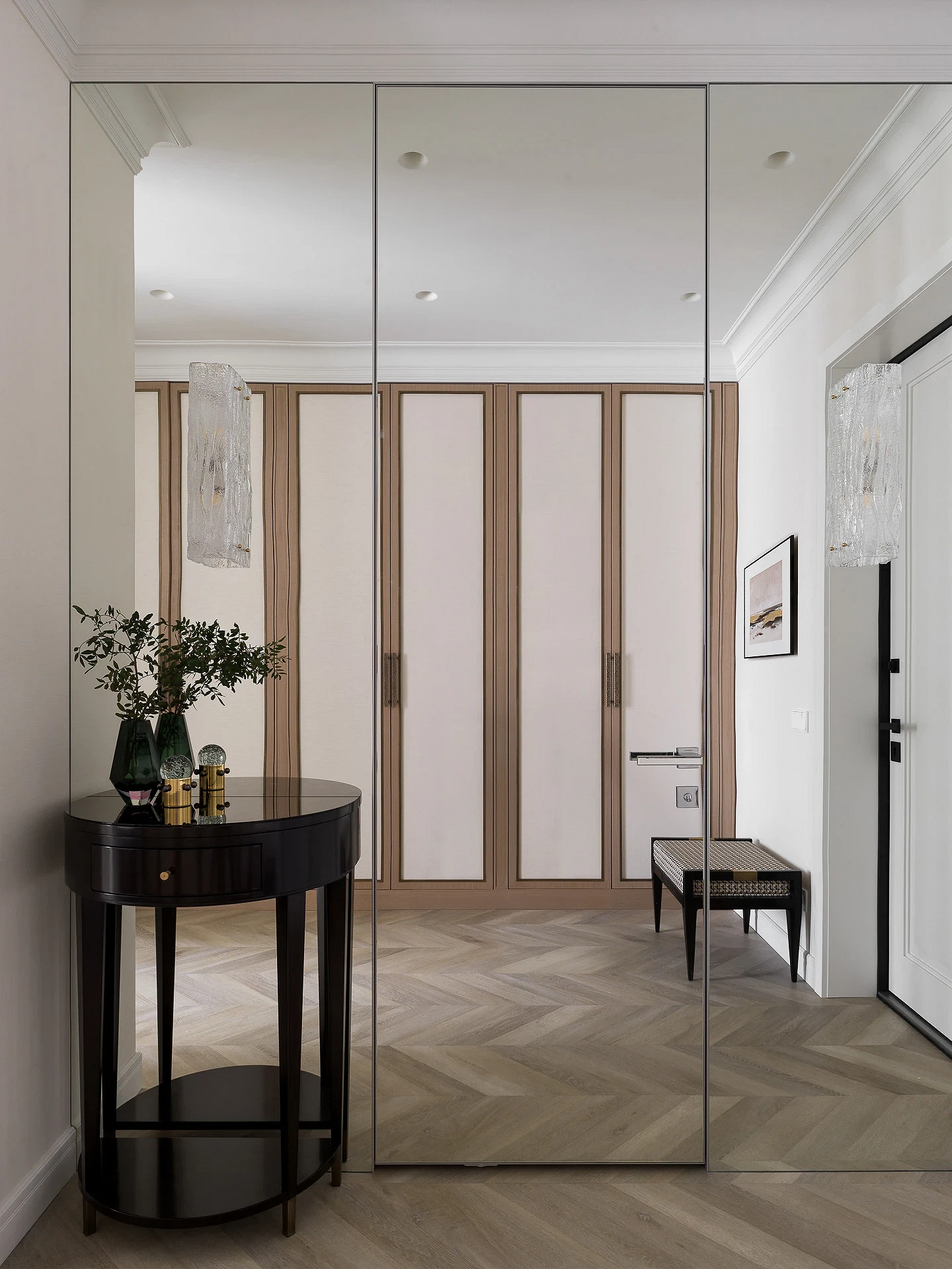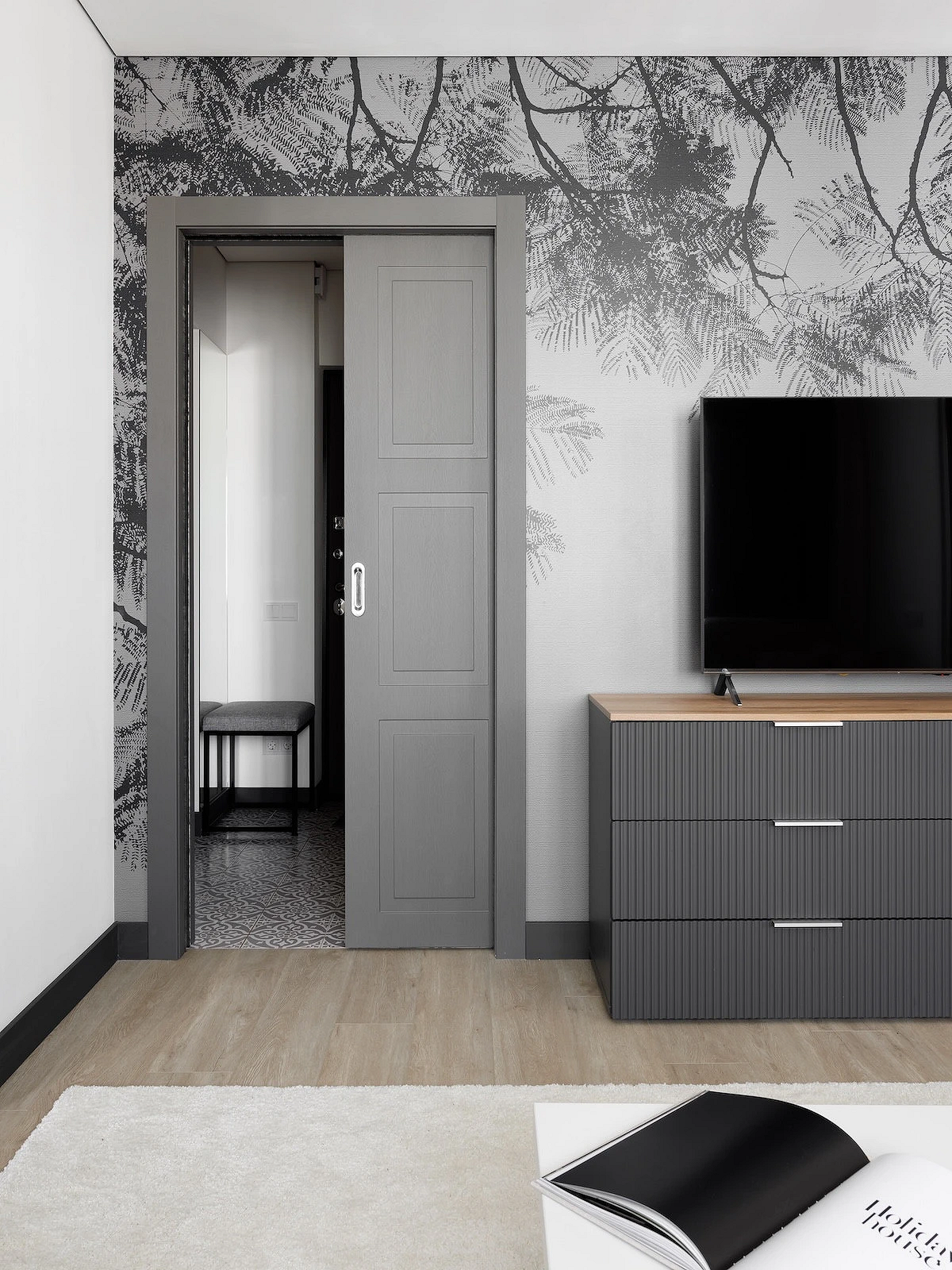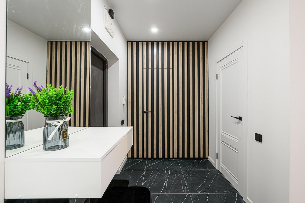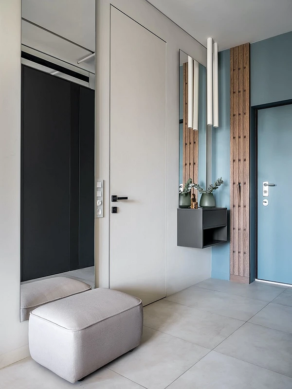 Скрытые полотна окрашивают в цвет стен, закрывают зеркальной панелью или отделывают тем же материалом: штукатуркой, панелями, обоями, микроцементом. Также важно учесть, что из-за особенностей монтажа двери нужно закладывать заранее, еще на этапе ремонта.