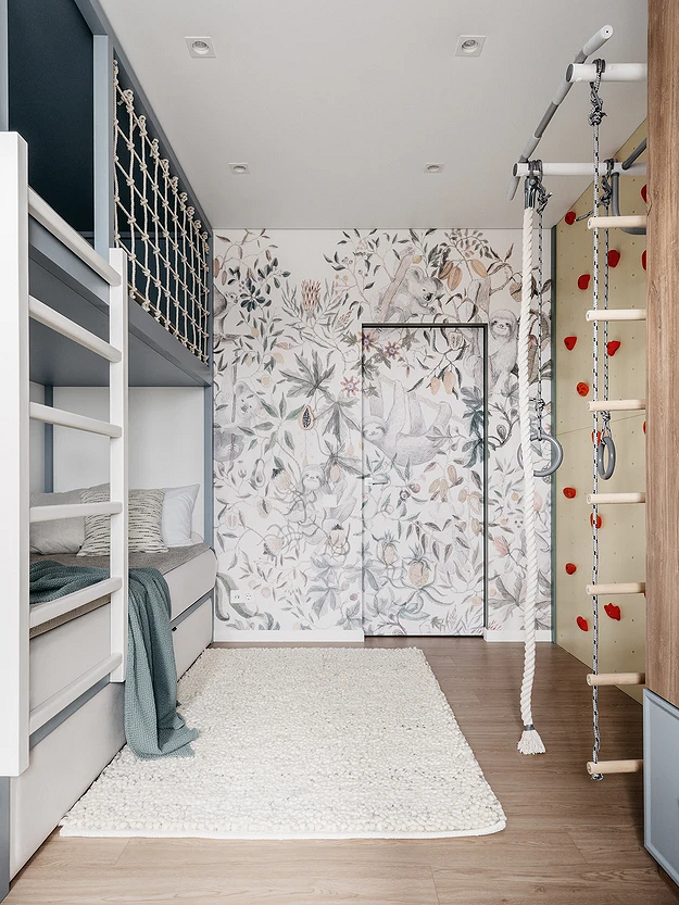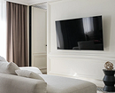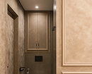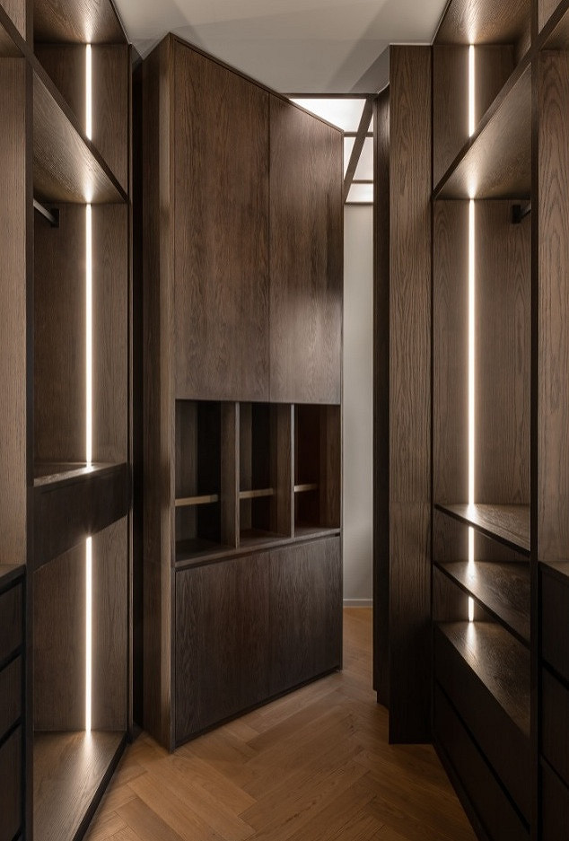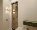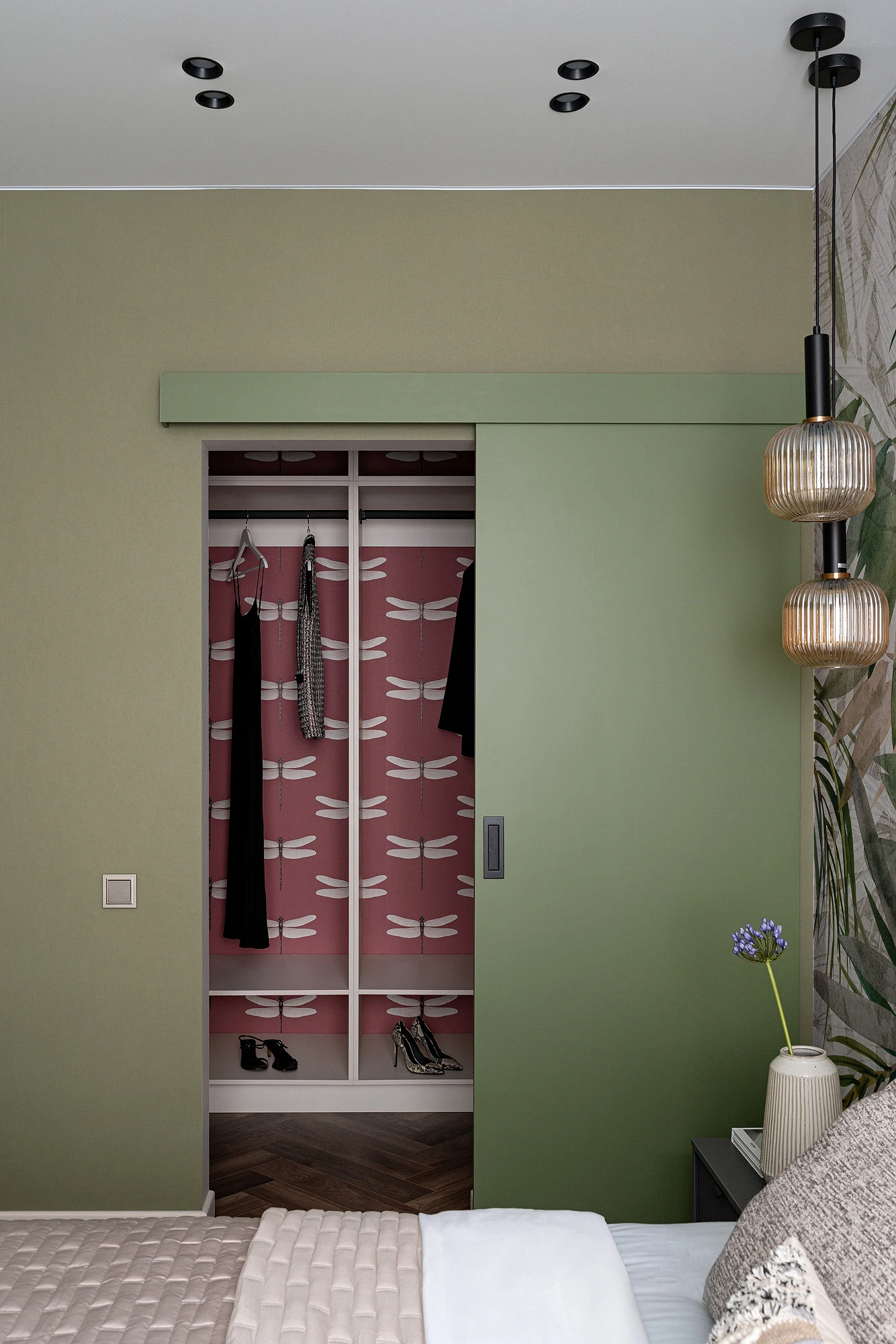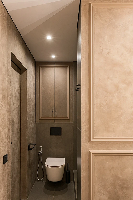 Скрытые полотна окрашивают в цвет стен, закрывают зеркальной панелью или отделывают тем же материалом: штукатуркой, панелями, обоями, микроцементом. Также важно учесть, что из-за особенностей монтажа двери нужно закладывать заранее, еще на этапе ремонта.