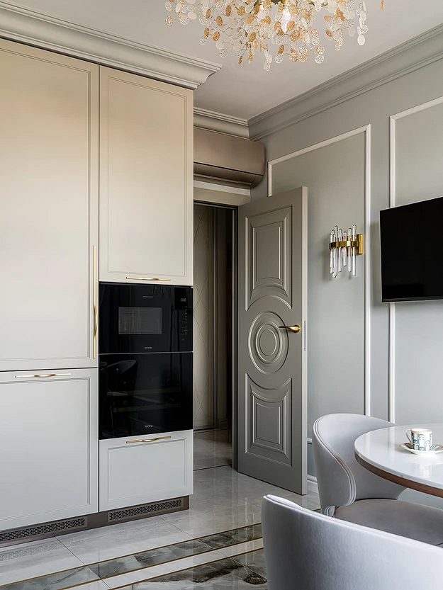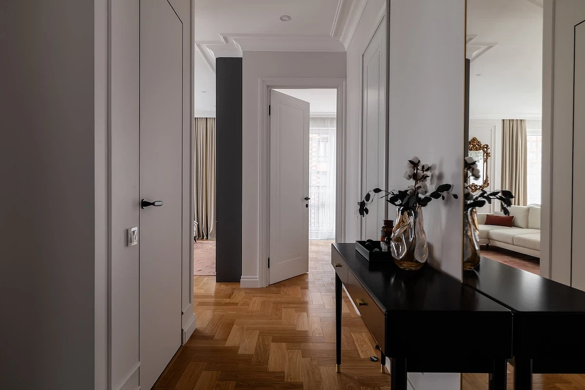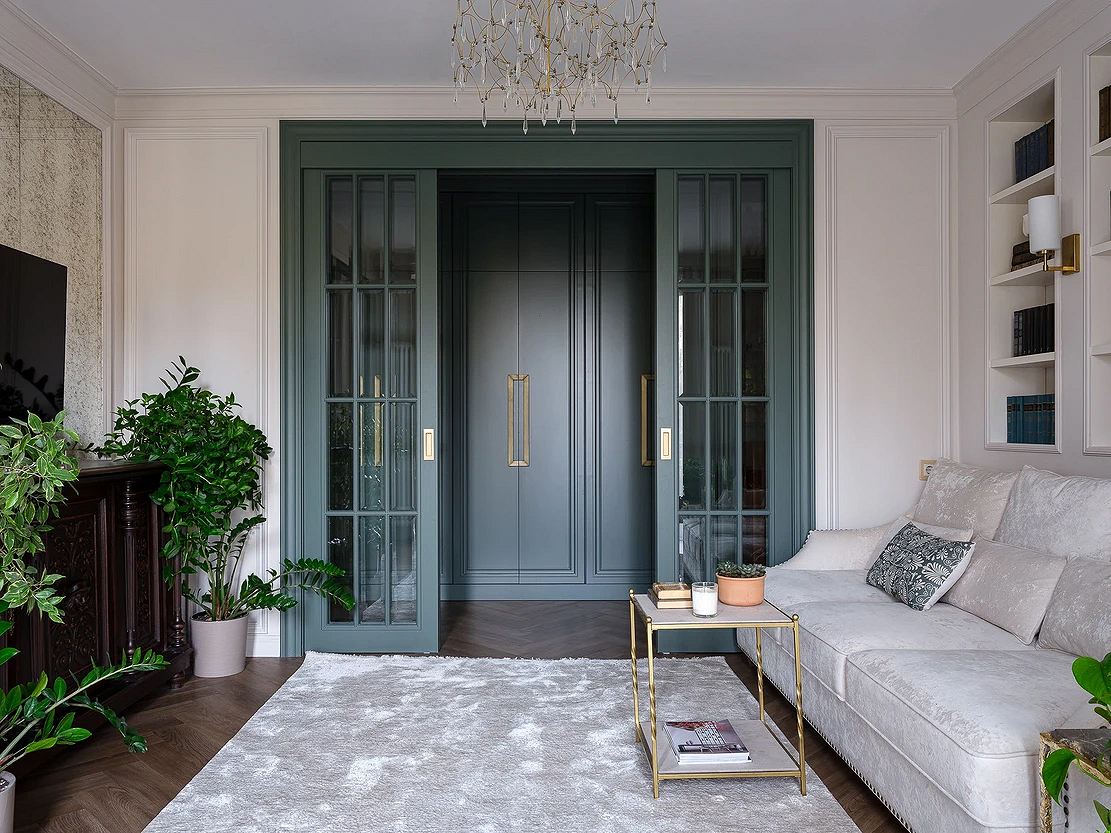 Если же в квартире невысокий потолок и установить полноразмерные двери такого формата невозможно, используйте декоративные решения. Это могут быть удлиненные полотна стандартной ширины, крупные наличники или оформление верхней части проема молдингами. Важно, чтобы дверь смотрелась цельно, а все декоративные конструкции были качественными. Тогда даже при стандартной высоте полотна будут смотреться так, как задумано, и зрительно вытягивать стены вверх.