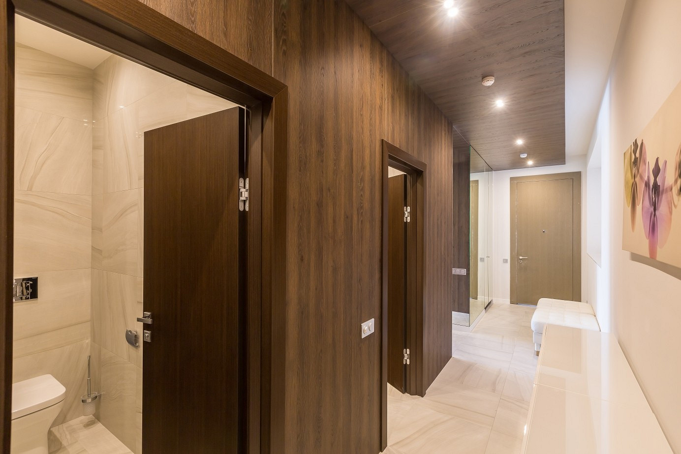 - Совместимость с интерьером. В небольшой комнате дверь занимает почти всю стену. Вы можете использовать ее как яркий акцент или попробовать растворить в интерьере. Не забудьте, что с другой стороны коридор или жилая комната. Выбирайте модель, которая будет гармонировать со стилем каждого помещения.