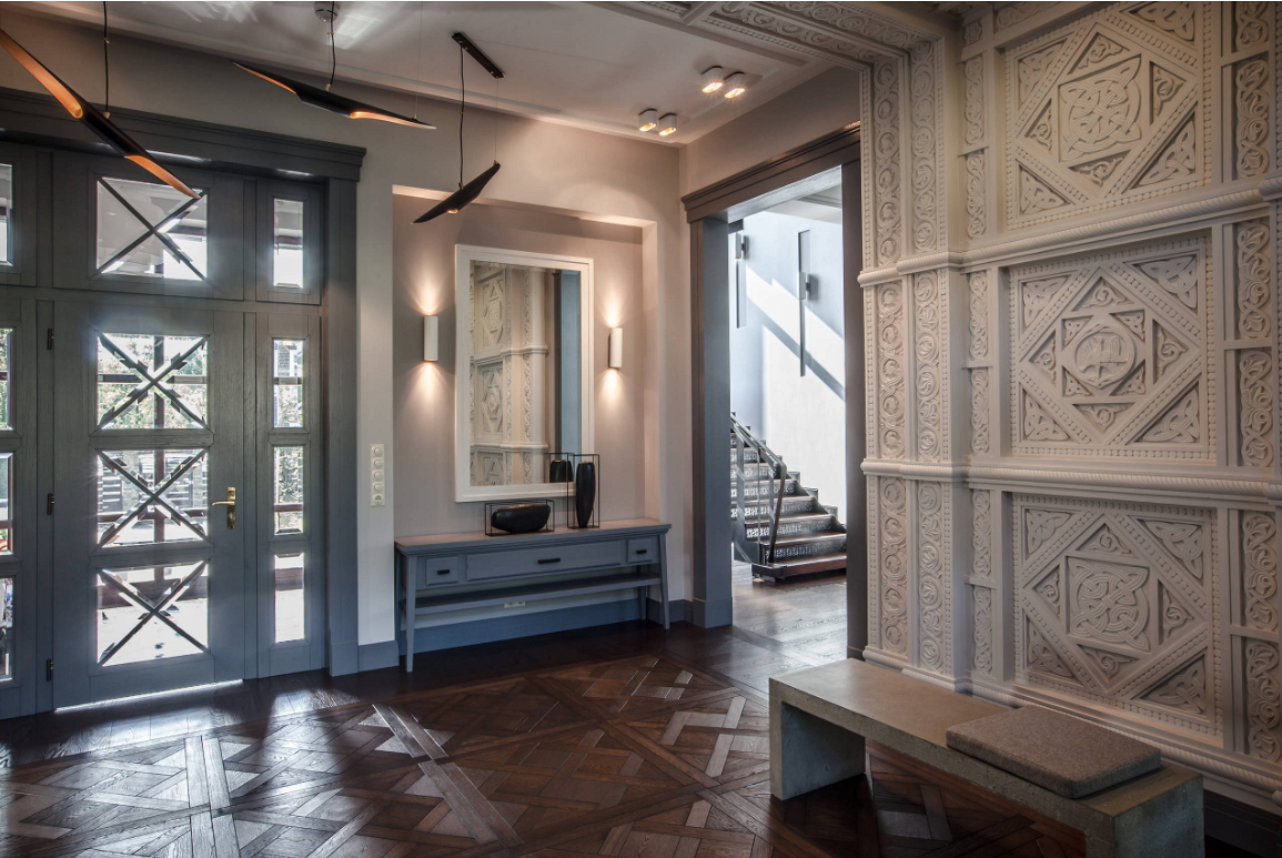 Используется, если нужно подчеркнуть какие-либо предметы во входной зоне, сделать акценты или зрительно разделить части помещения.
