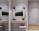 Обязательна дополнительная подсветка зеркала. Оптимальное расположение светильников — по бокам от него, поскольку прямые световые лучи сверху может давать тени на лицо. Отдельное внимание обращаем на температуру света: чаще всего перед зеркалом поправляют макияж, а слишком жёлтые лампочки искажают картину.