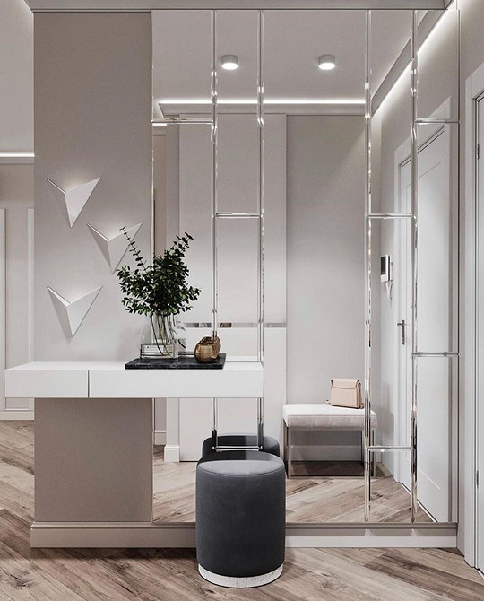 Так как прихожая в большинстве квартир имеет маленькую площадь и нехватку солнечного света, приходится ее зрительно увеличивать и качественно освещать. Не вешайте один светильник по центру потолка, так как это создаст недостаток освещения у основания стен и зрительно очень уменьшит пространство. Вместо этого попробуйте установить ряд точечных светильников вдоль одной из стен — это сделает прихожую визуально длиннее. В этой освещенной зоне можно расположить обувницу и хранить разные мелочи, а на противоположной стене для максимального зрительного расширения пространства повесить крупное зеркало.