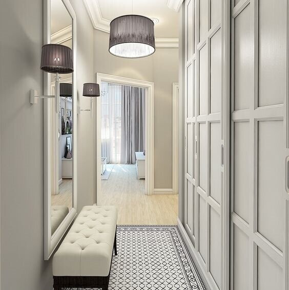 Узкий вытянутый коридор, наоборот, не стоит освещать несколькими лампами по всей длине, так как это только подчеркнет его планировку. Вместо этого попробуйте разместить два-три светильника поперек потолка или сделать по одному светильнику в начале и конце коридора, чтобы визуально его сократить.
