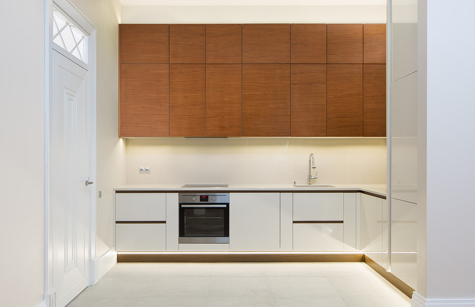 Подсветка верхнего ряда кухонных шкафов уже считается классикой, но дополнительная иллюминация внизу, у самого пола, создает магический эффект «парящей» мебели. Кроме того, такая подсветка более мягкая — можно зайти на кухню попить воды ночью, не включая яркий верхний свет, который бьет по глазам. В итоге пространство смотрится эстетичнее, и пользоваться зоной готовки удобнее.