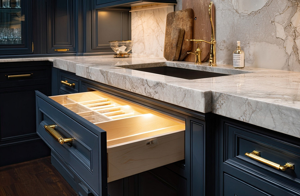 Многим это кажется излишеством, но беспроводная подсветка, которая загорается при выдвижении ящика, позволяет мгновенно найти нужную вилку или открывашку в сумерках, не включая основной свет на кухне. Это особенно удобно во время поздних ужинов или ранних завтраков, когда глаза еще не привыкли к яркому освещению. Такая мелочь ощутимо влияет на бытовой комфорт, и потом вы точно скажете себе спасибо.