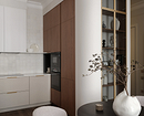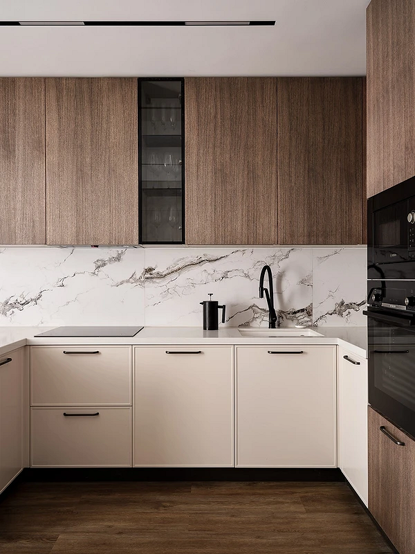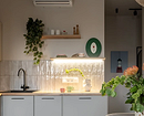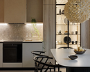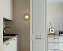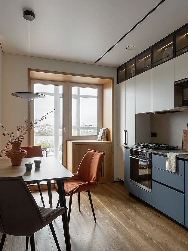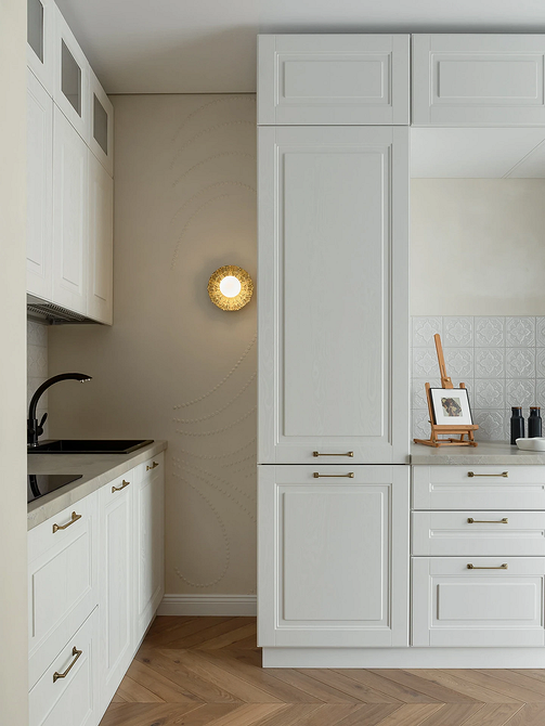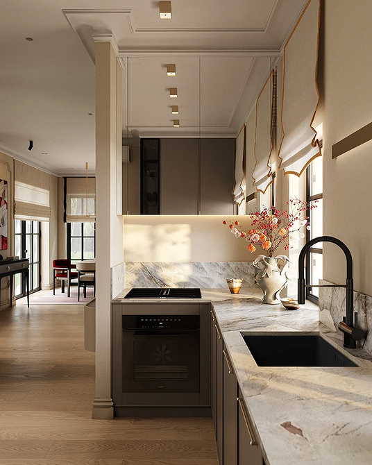 Здесь свет — это в первую очередь вопрос безопасности и удобства. Одной центральной точки мало, так как, стоя у столешницы, вы собственной тенью перекрываете свет. Поэтому основное внимание стоит уделить рабочей зоне: например, провести под верхними шкафами светодиодную ленту или подсветить полки внутри. Для потолка подойдут точечные или трековые светильники.