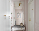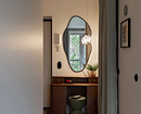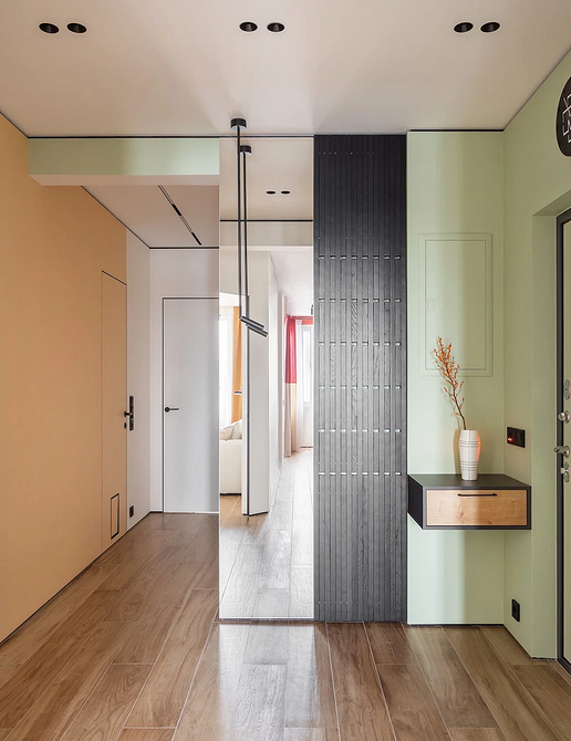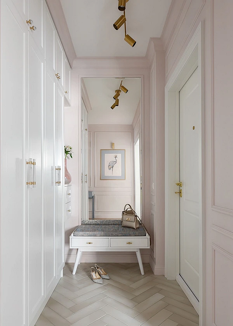 Это не только «лицо» дома, но и зона, где обычно нет окон. Его отсутствие нужно компенсировать и продумать подсветку ключевых зон. Для вытянутых прихожих и коридоров оптимальны незаметны встраиваемые лампы либо светодиодная подсветка. Сакцентировать внимание на зеркале помогут подвесы или настенные бра. В минимализме их можно заменить световой линией по контуру.