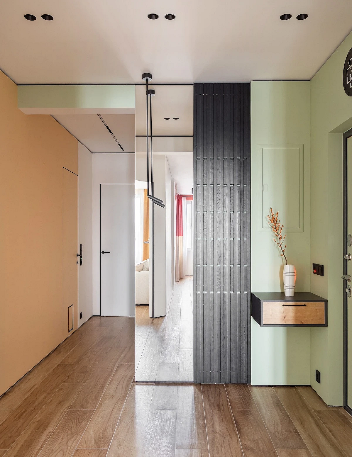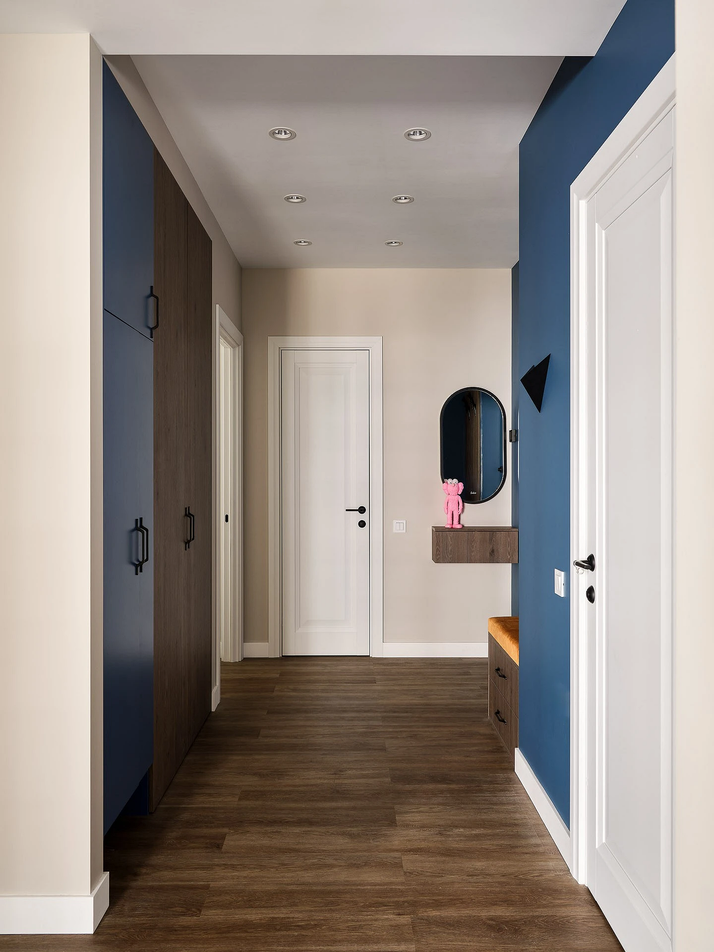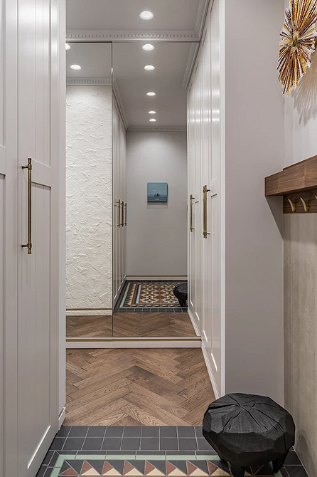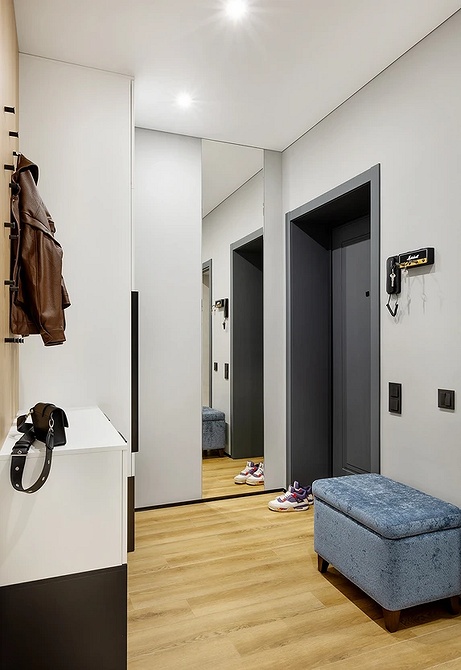 В коридоре удобна ночная подсветка с датчиком движения — она позволит перемещаться по квартире, не включая основной свет и не ища выключатель в темноте.