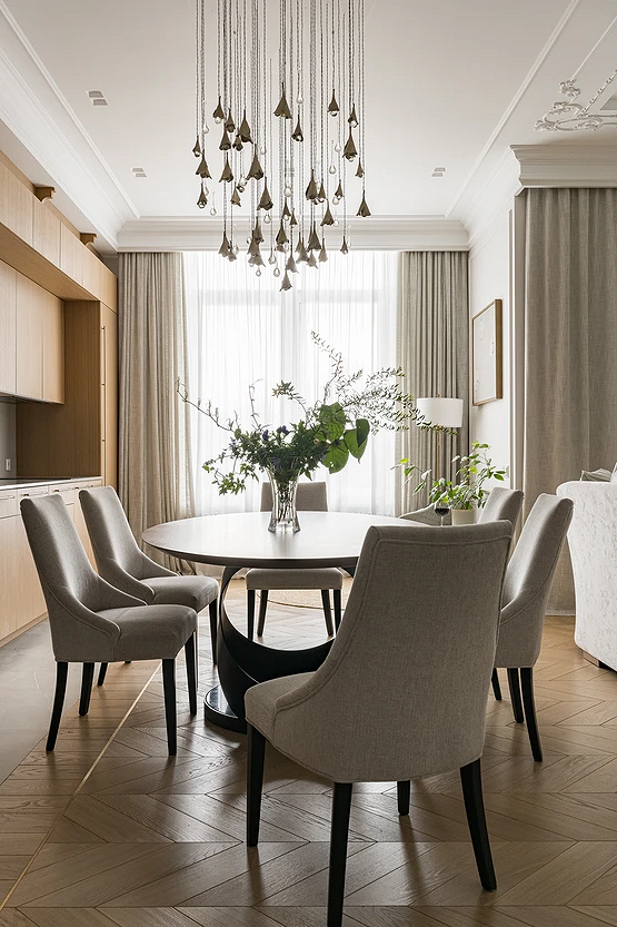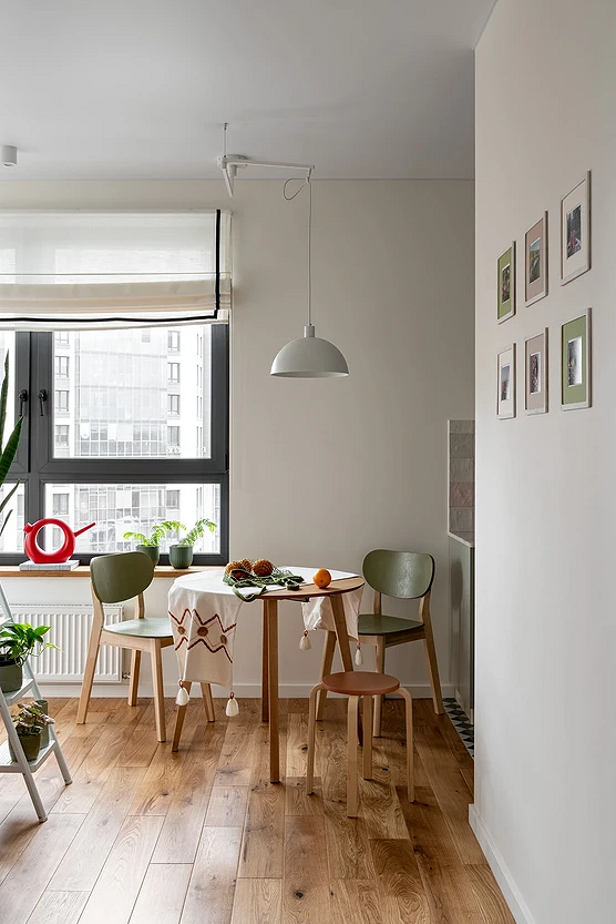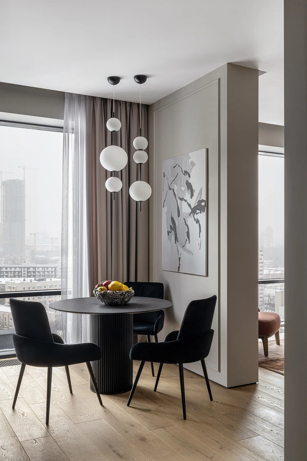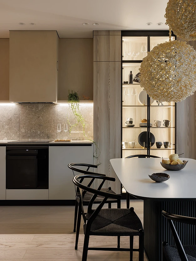 Если на кухне стоит обеденный стол, его стоит подсветить отдельно. Это могут быть низко свисающие подвесы или бра на стене. Подсветка здесь не только функциональна, но и зрительно отделяет место отдыха от зоны готовки. Главное — выбирайте лампы с теплым спектром, чтобы еда выглядела аппетитно.