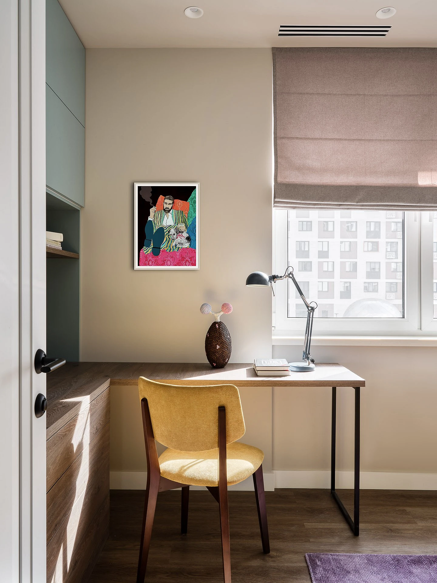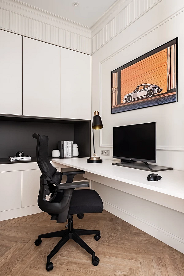 В этой комнате свет напрямую влияет на продуктивность и утомляемость. Важно, чтобы не было резких теней и бликов на мониторе. Основное освещение потолка без люстры должно быть нейтральным и спокойным, а рабочий стол — освещен мощным направленным источником с левой стороны (для левшей наоборот).