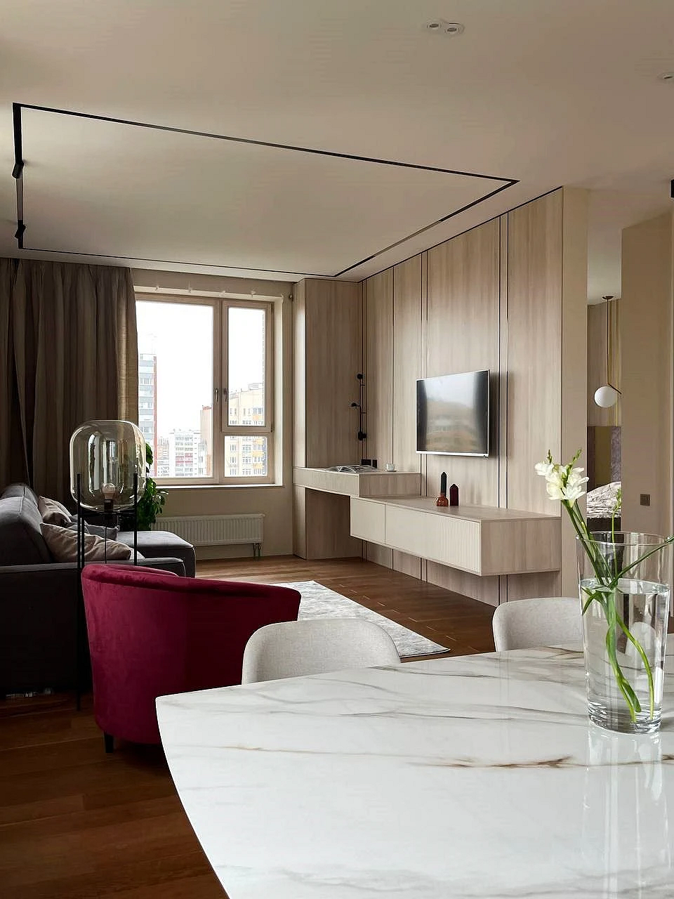 - Даже самая изящная люстра физически и зрительно «съедает» высоту помещения. Плоский же потолок кажется выше, а комната — чуть просторнее. Для маленьких типовых квартир и студий это критически важно.