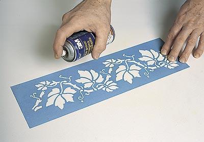 Клеевой состав наносится из аэрозольного флакона на обратную сторону полиэтиленового трафарета. Это позволит переклеивать его несколько раз. Чтобы облегчить нанесение рисунка три тампона или трафаретных кисти пропитываются краской, которую для этого раскатывают по бумаге. |