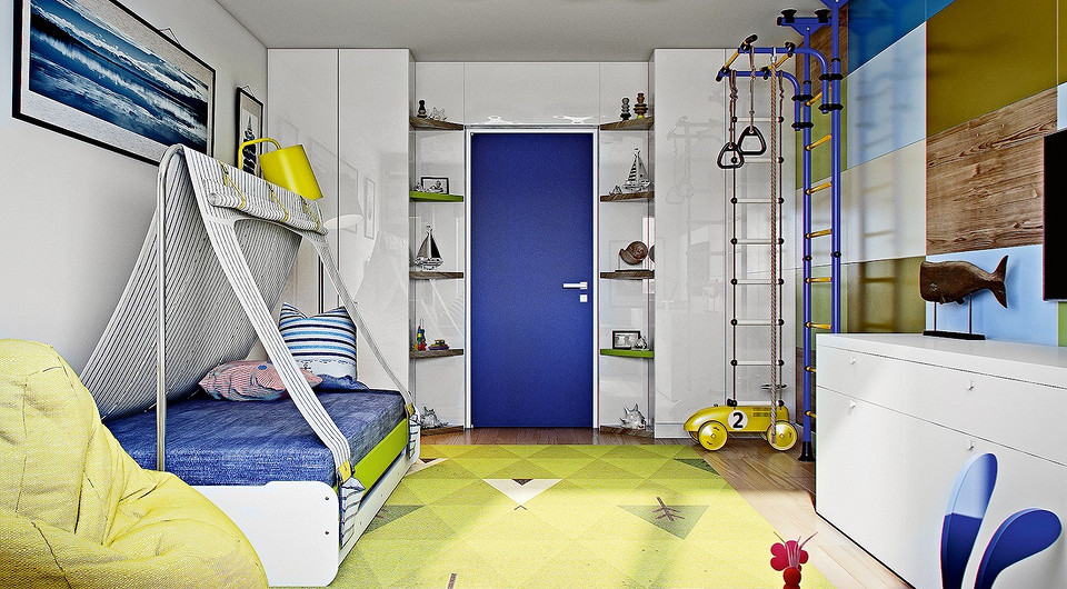 Подбирая материал для оформления стен в детской комнате, авторы проекта предлагают использовать практичную интерьерную краску. При этом для отделки спортивной зоны они советуют взять ЛДСП, устойчивую к механическим повреждениям и загрязнениям. Помимо прочего, этот материал характеризуется исключительной широтой цветовой палитры, богатой не только на цвет, но и на степень блеска, а также на фактуру защитного покрытия (ламинирующего слоя).