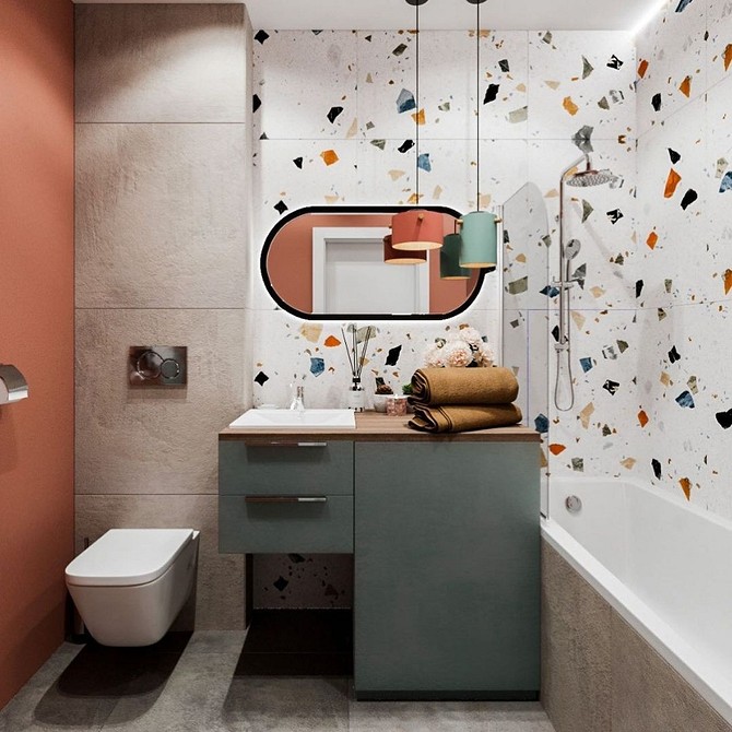 В ванной комнате мы наблюдаем два подхода к использованию терраццо: плитка с цветными вкраплениями как акцент либо сдержанный серо-черный или бежевый вариант в качестве нейтрального фона.