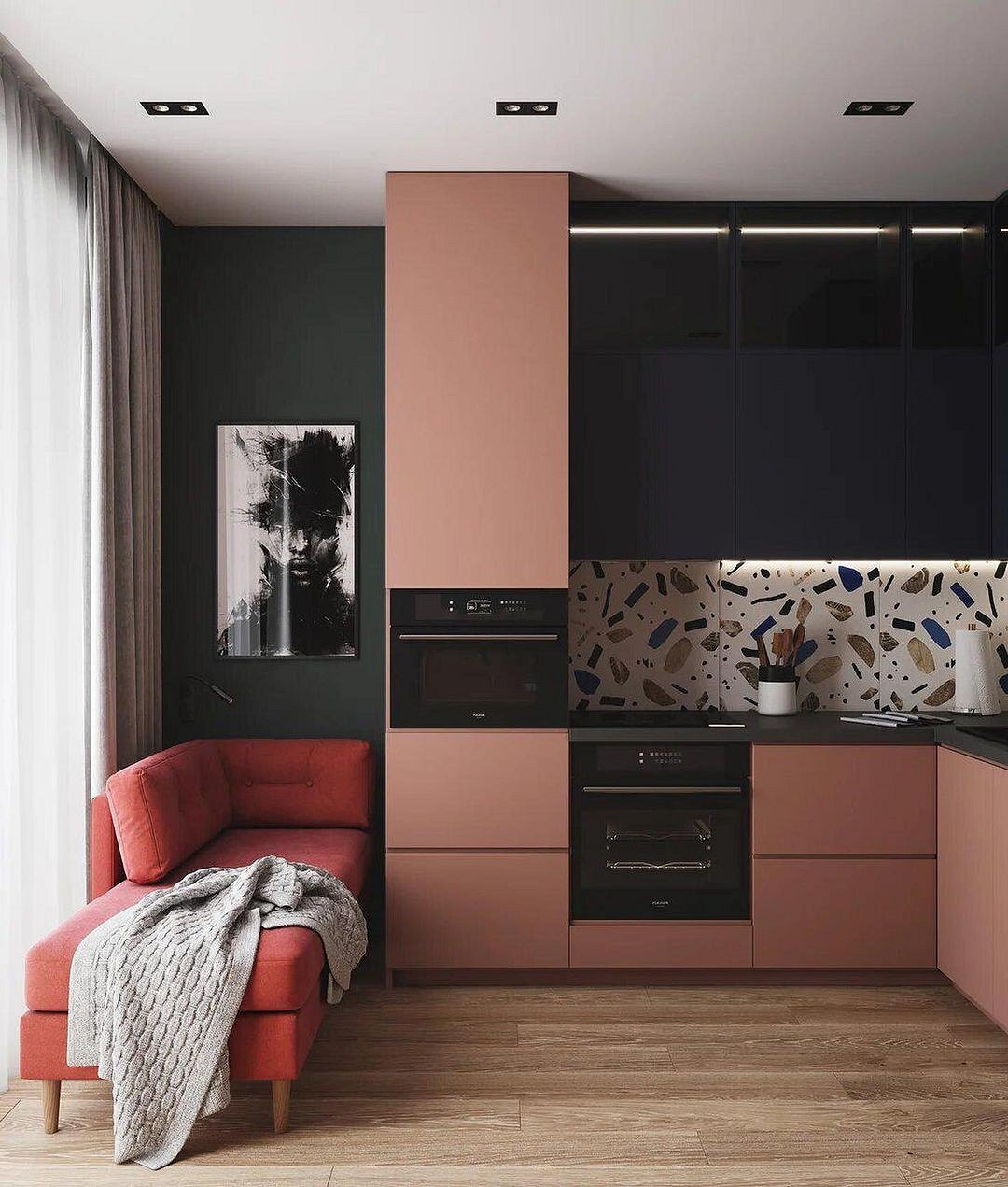 Также узор в крапинку хорошо смотрится на рабочей поверхности, особенно на контрасте с однотонным кухонным гарнитуром. Интересный прием — одна отделка и для фартука, и для столешницы на контрасте с остальной мебелью.