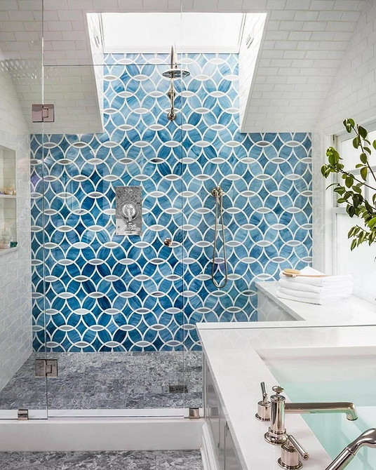 После того как Pantone назвал цветом года Classic Blue (классический синий), разнообразные его вариации просочились в интерьеры со стремительной скоростью. Очередь дошла и до плитки. Например, привычный «кабанчик» в морской палитре выглядит гораздо интереснее, чем в классических и нейтральных цветах. Эта форма и раскладка уже теряет актуальность, однако в синем цвете выглядит по-прежнему современно.