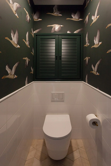 Еще один трендовый способ использовать обои — оклеить ими не всю стену. Тем более комбинация нескольких материалов всегда смотрится хорошо. Полотнами можно оформить нишу, поверхность над камином или столом, заднюю стенку шкафа. Использовать их вместе с молдингами и декоративными панелями, сочетать с краской и плиткой. Интересный вариант — просто оклеить половину или треть стены, даже не обрамляя полотно в рамку.