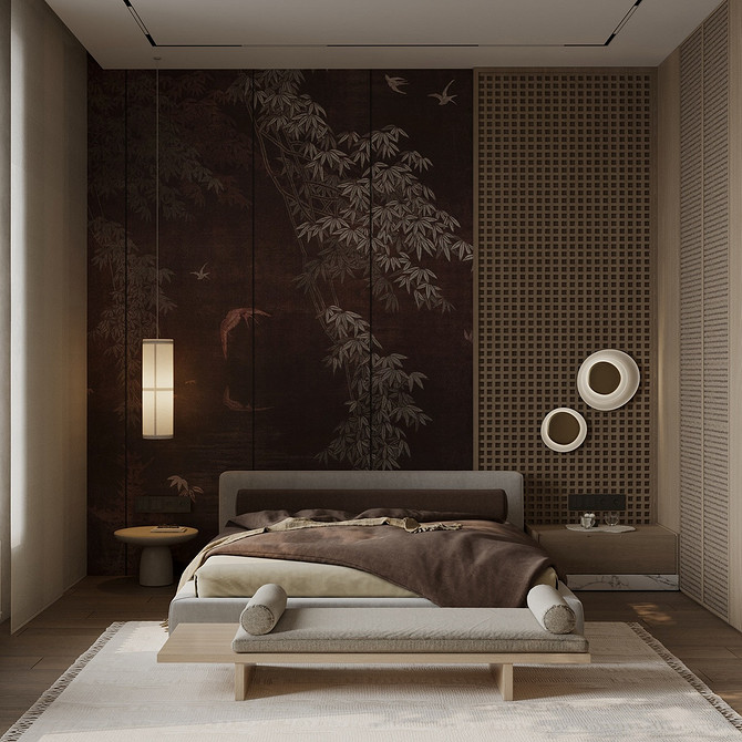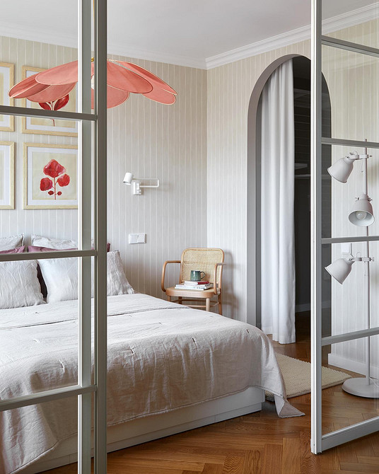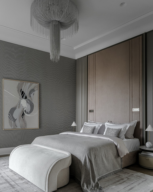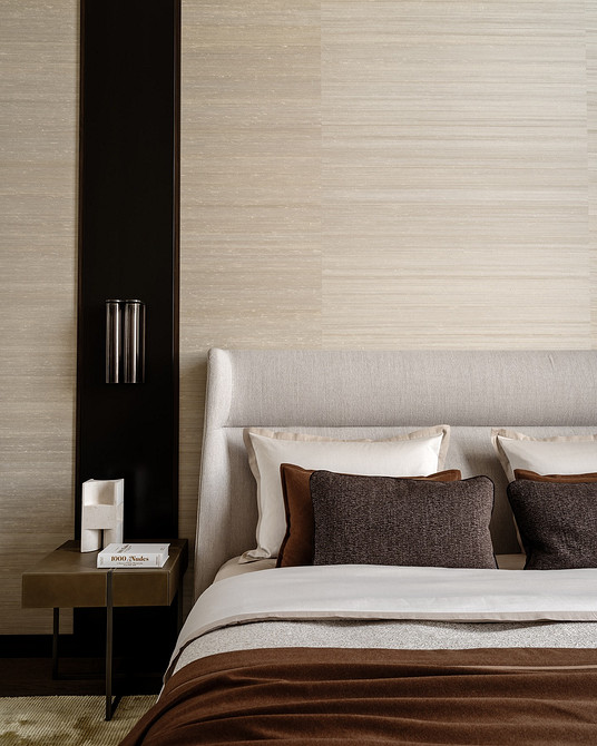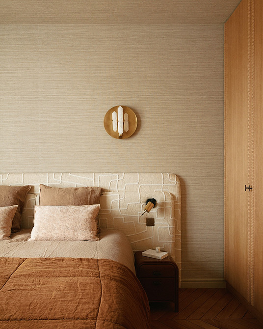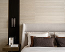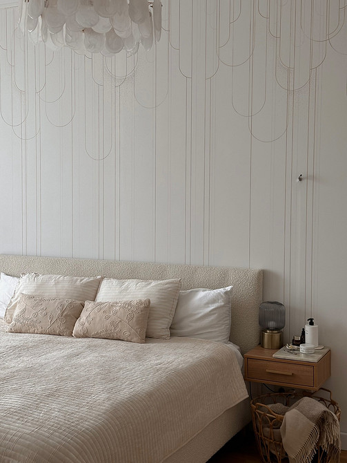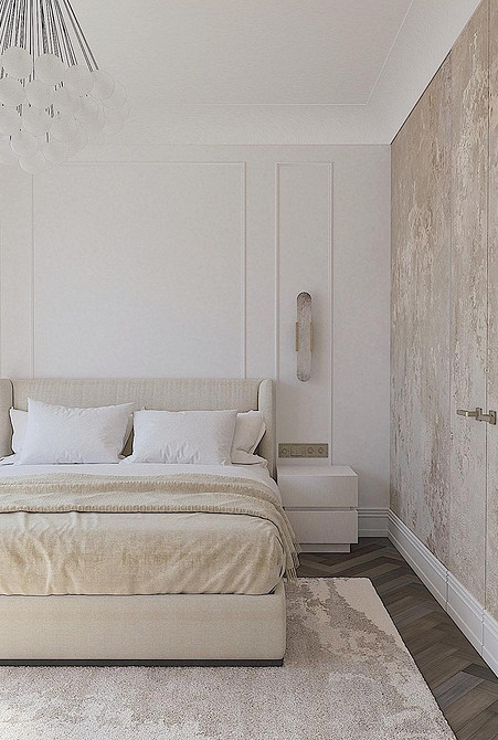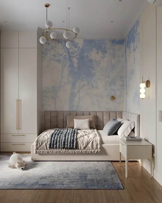 - Для спальни оптимальны дышащие материалы: бумажные, флизелиновые и текстильные полотна. Тактильность и экологичность здесь важнее, чем износостойкость. Часто используют покрытия под покраску — их можно освежить, не меняя отделку полностью.