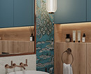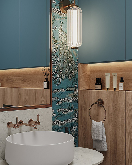 Покрытия в сине-серой гамме лучше всего сочетать с теплыми материалами: деревом, керамикой, ротангом, многослойным текстилем. Это смягчает палитру и компенсирует холодность стен, делает обстановку более уютной.