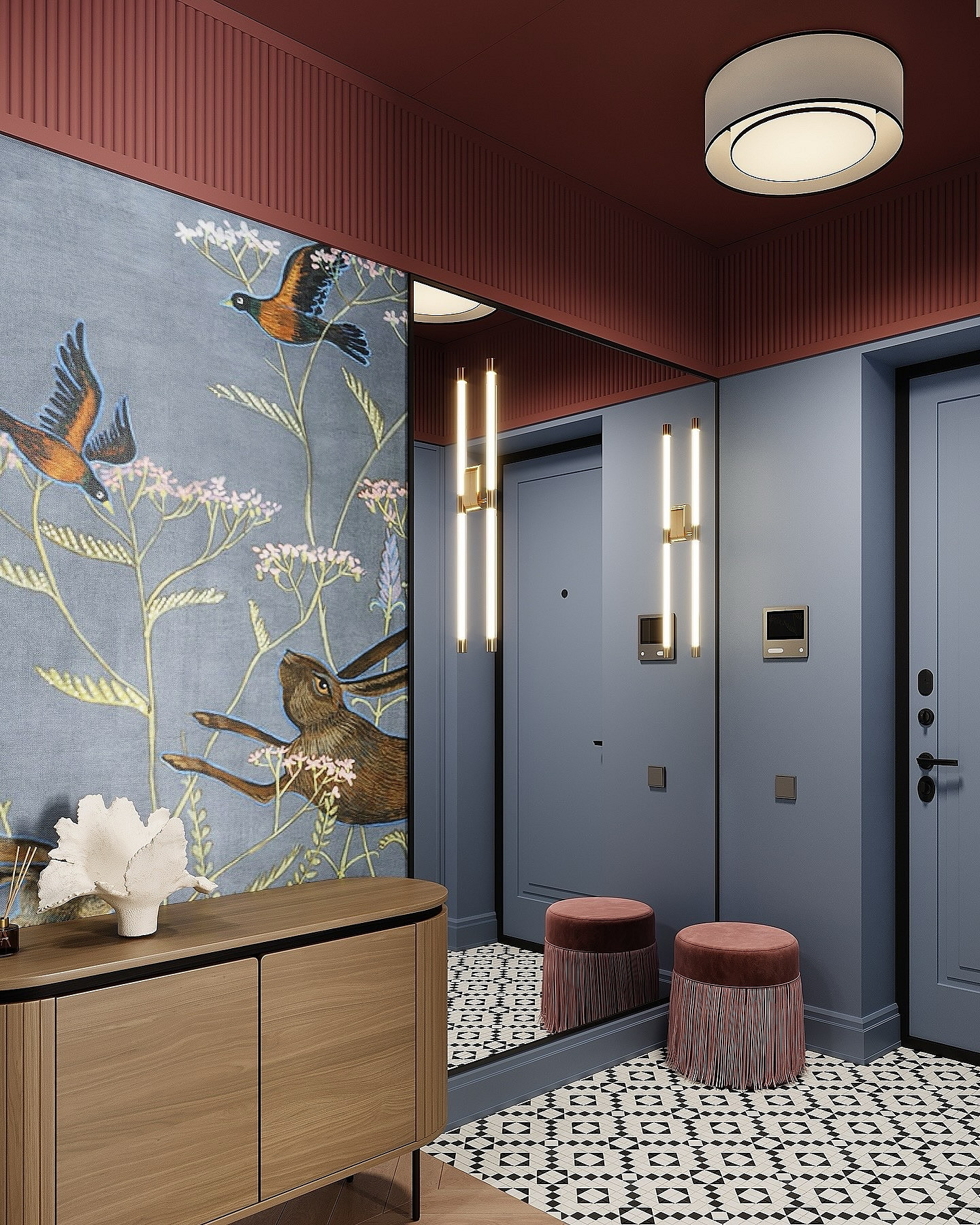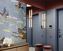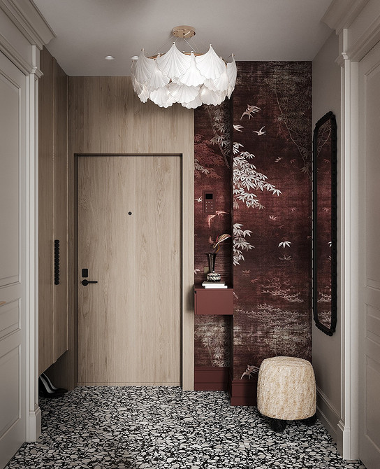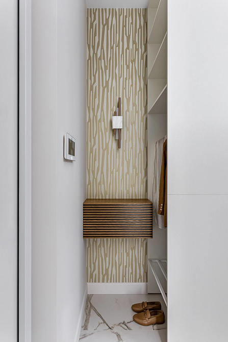 - Для прихожей и коридора подойдут покрытия, устойчивые к механическим повреждениям. Это зоны активного движения, где стены часто пачкаются и подвергаются трению. Лучшие варианты — виниловые обои или флизелиновые, стекловолокно.
