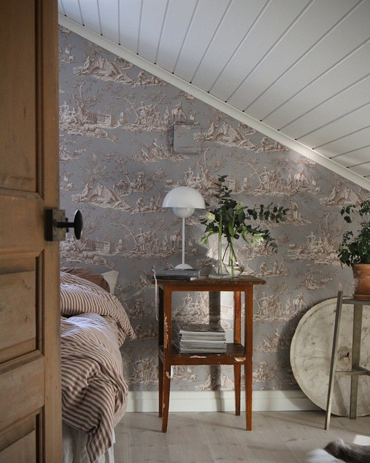 Обои с орнаментом жуи органично смотрятся в классическом и деревенском стиле. Но вписать их можно и в современный дизайн, особенно если он сам по себе эклектичный. Полотна, как правило, применяют акцентно. Но если рисунок ненавязчивый и неброский, отделка может быть и фоновой.