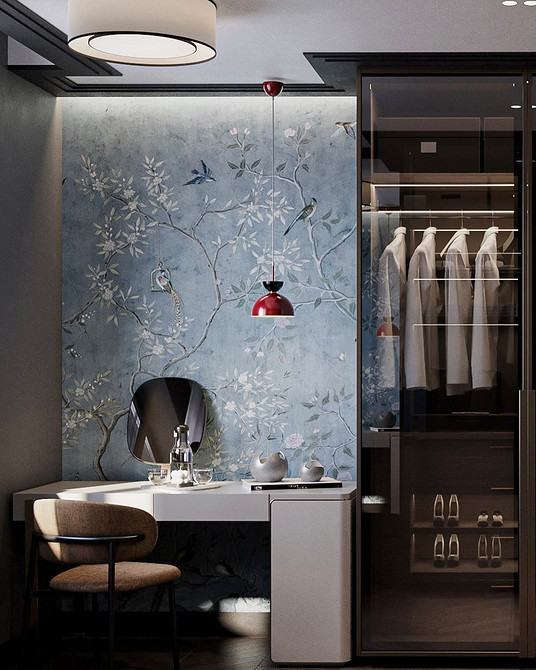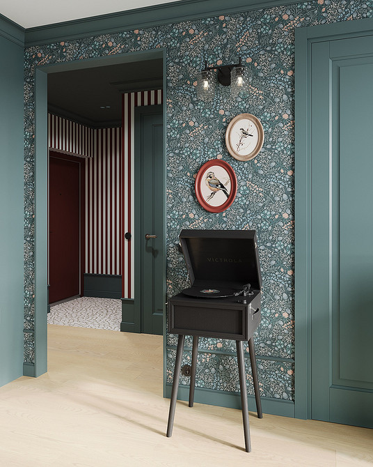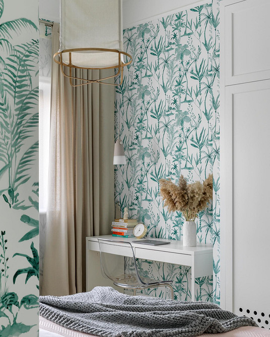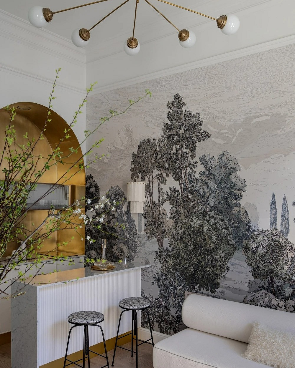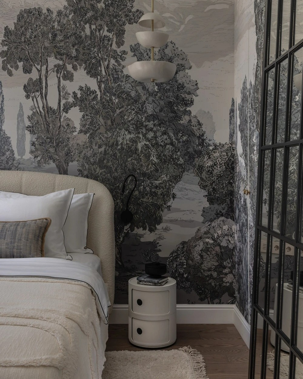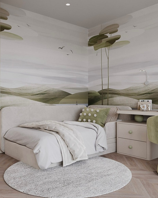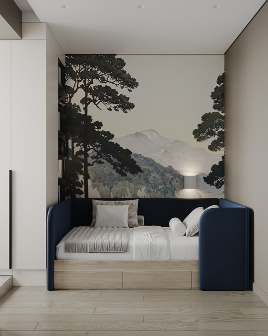 Рисунки с растениями и животными — классическая тема для оформления стен, которая не теряет актуальности. В 2026-м модными будут обои с изображениями ветвей, листьях, птиц или зверей в спокойных естественных тонах. Если рисунок крупный и контрастный, обои лучше применять как акцент: например, на одной стене или в нише. Если же узор неброский, стилизованный, то отделка может быть и основной