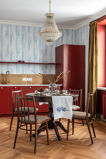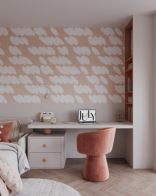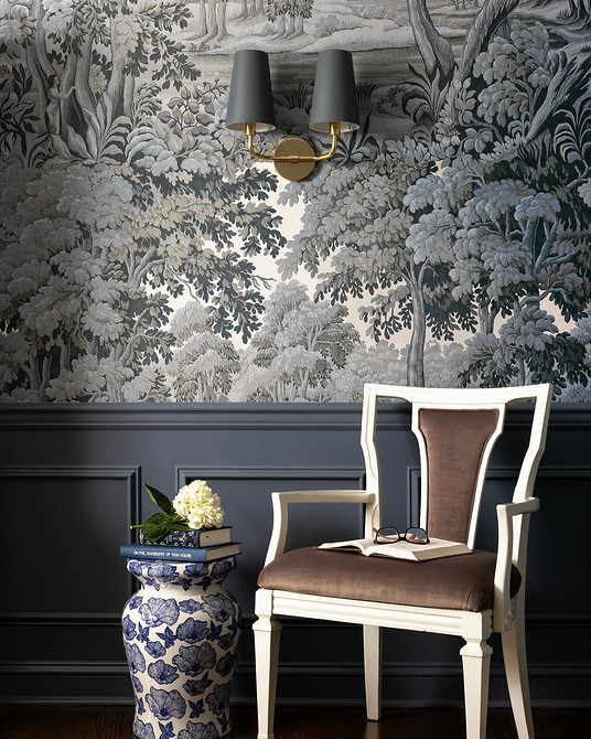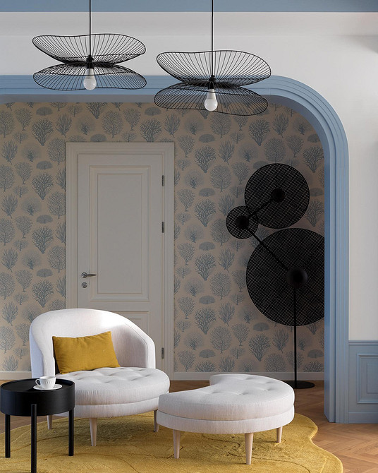 Такие обои хорошо сочетаются с нейтральной деревянной мебелью, текстилем в тех же тонах и контрастным декором. Решение универсальное, подходит для всех комнат, может быть фоном или акцентом. Стилистически лучше всего вписывается в классику, эклектику, сканди и кантри.