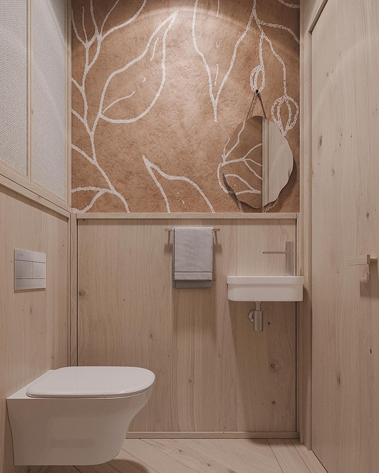 Обои могут быть однотонными или с рисунком, также сейчас популярен мягкий градиент — плавный переход от одного природного тона к другому. Для поддержки естественной гаммы выбирают светлые или темные базовые оттенки: белый, бежевый, серый, черный.
