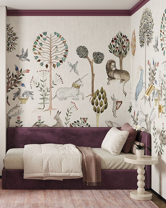 Сюжетные обои с фантазийными элементами окончательно выделились в полноценный тренд. Изначально они применялись только в детских, но все чаще встречаются и во «взрослых» интерьерах. На стенах появляются сказочные растения, причудливые животные, волшебные сады и замки, выполненные в приглушенной акварельной гамме.