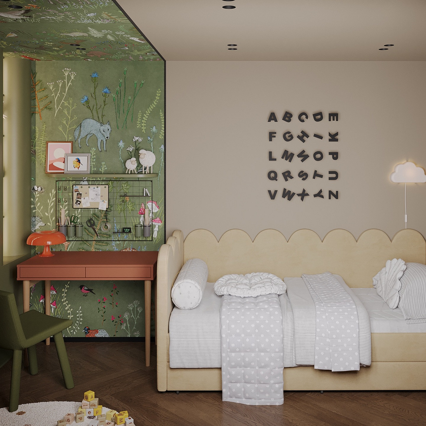 - Для детской необходимы не просто экологичные, но и прочные, простые в уходе материалы. Например, флизелиновые обои с плотной структурой легко очищаются, не боятся ударов, пятен и следов творчества. Если дети маленькие, стоит избегать сильно рельефных поверхностей: на них скапливается пыль и их сложнее мыть.