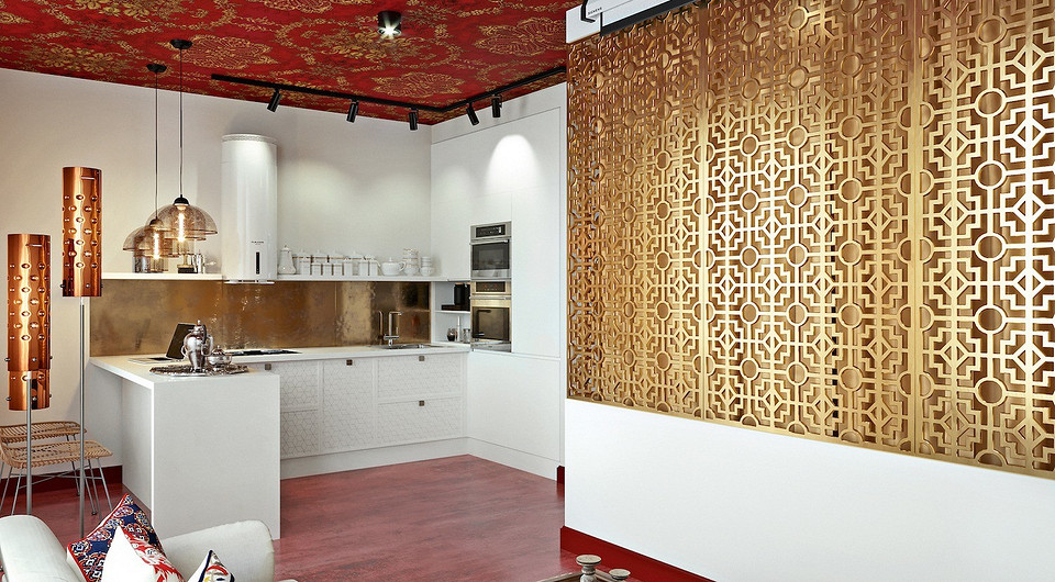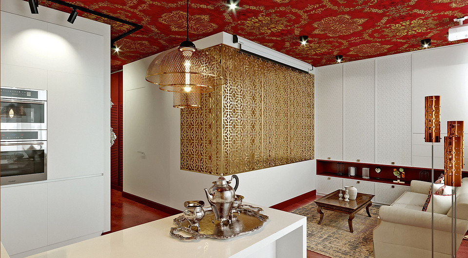 Материалом отделки потолков во всей квартире (за исключением ванной комнаты) дизайнер предлагает сделать текстильные обои на флизелиновой основе из коллекции Brocard фабрики Zuber. Данное покрытие привлекло автора проекта насыщенностью фона и активностью узора (золотых медальонов), что прекрасно подходит для создания интерьера в стиле фьюжн с этническими мотивами. К тому же материал положительно характеризуется в процессе эксплуатации.