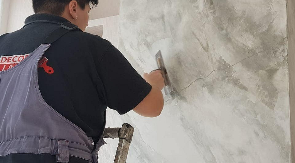 - Нанесение отделки. Сначала накладывается первый, базовый, слой. После того как он просохнет, специальным шпателем наносят второй слой штукатурки. Он накладывается своеобразными рваными движениями, материал сразу же затирается. В зависимости от того, какой результат планируется получить, накладывается от 4 до 9 таких слоев. Каждый из них после полного затвердевания аккуратно шлифуется.