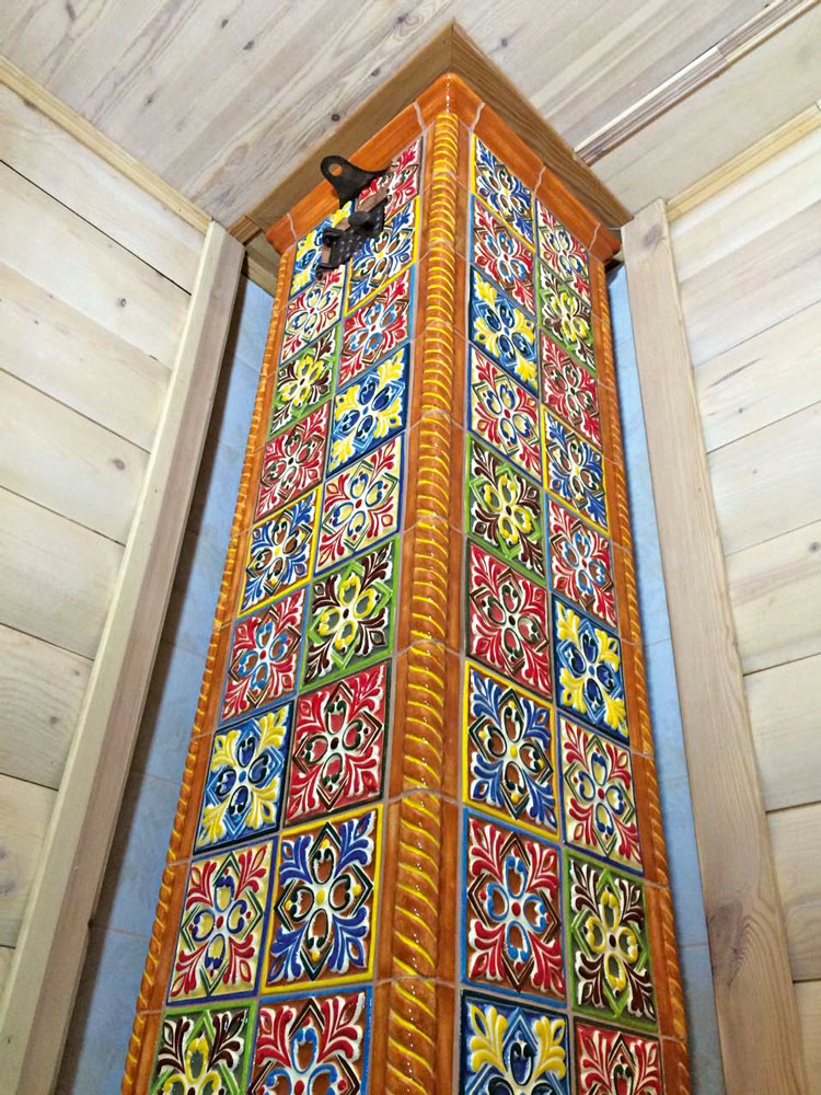 Изразцами облицовывают не только печь, но и дымовую трубу, причём нередко в пределах всех жилых этажей дома. Фото: «Керамика Декор»
