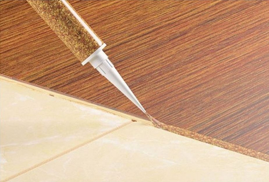 - Нанесите клей на всю ширину ламината или кафеля, а на дно — тонкий слой герметика.