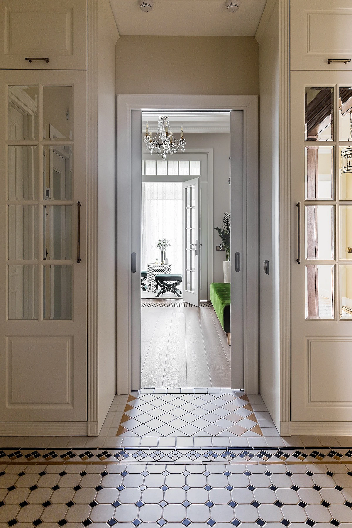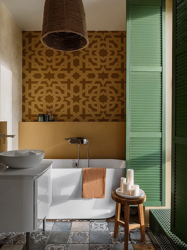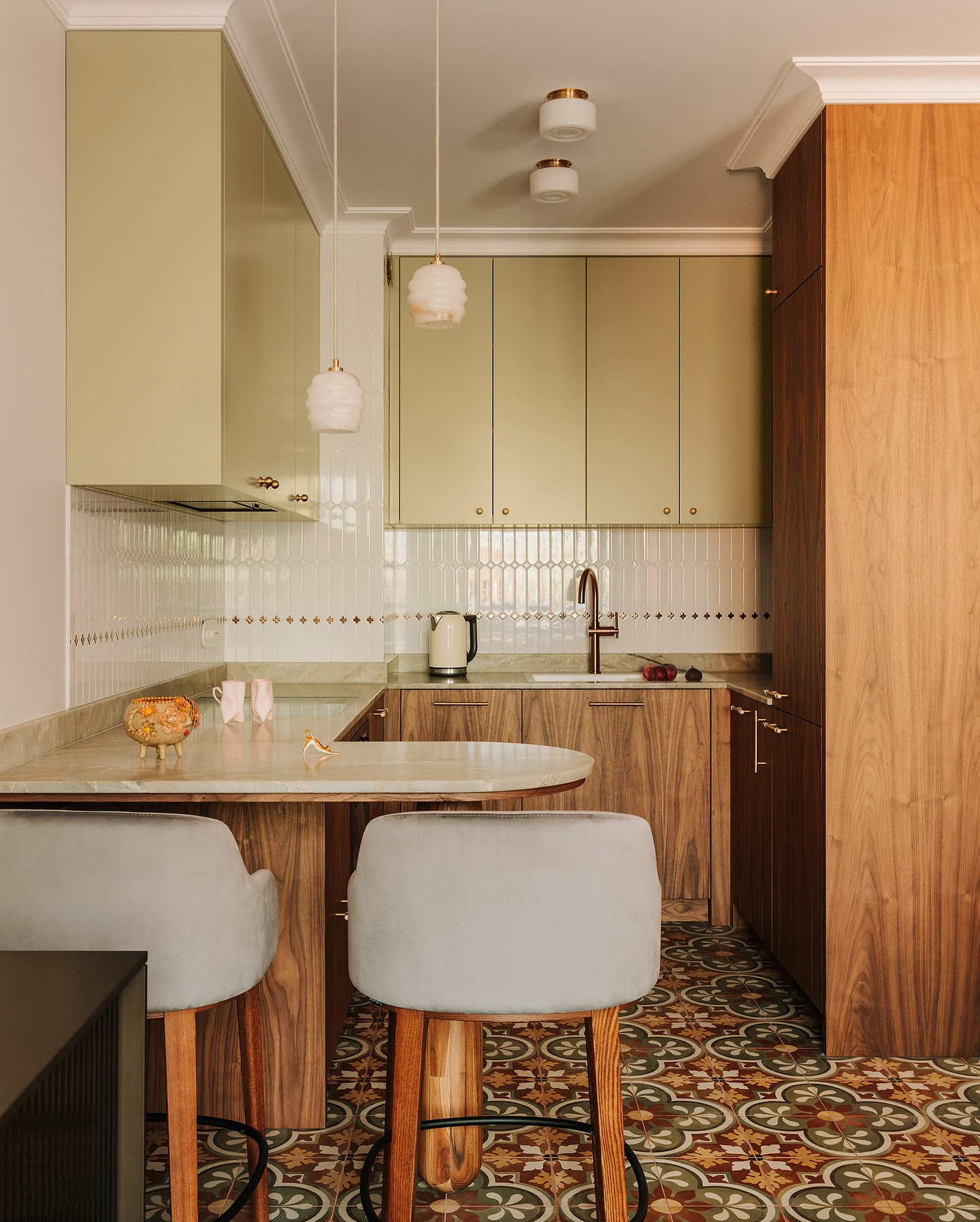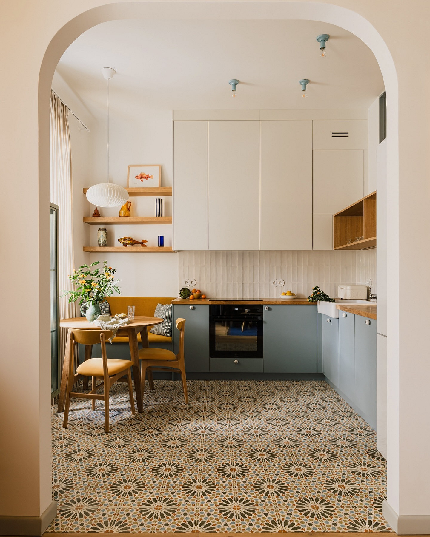 Винтажные мотивы можно встретить в 2026-м в дизайне плитки на кухне, в ванной или входной зоне. Такой пол становится выразительным акцентом, поэтому лучше всего окружить его нейтральными отделкой и мебелью, а ретротему поддержать отдельными предметами.