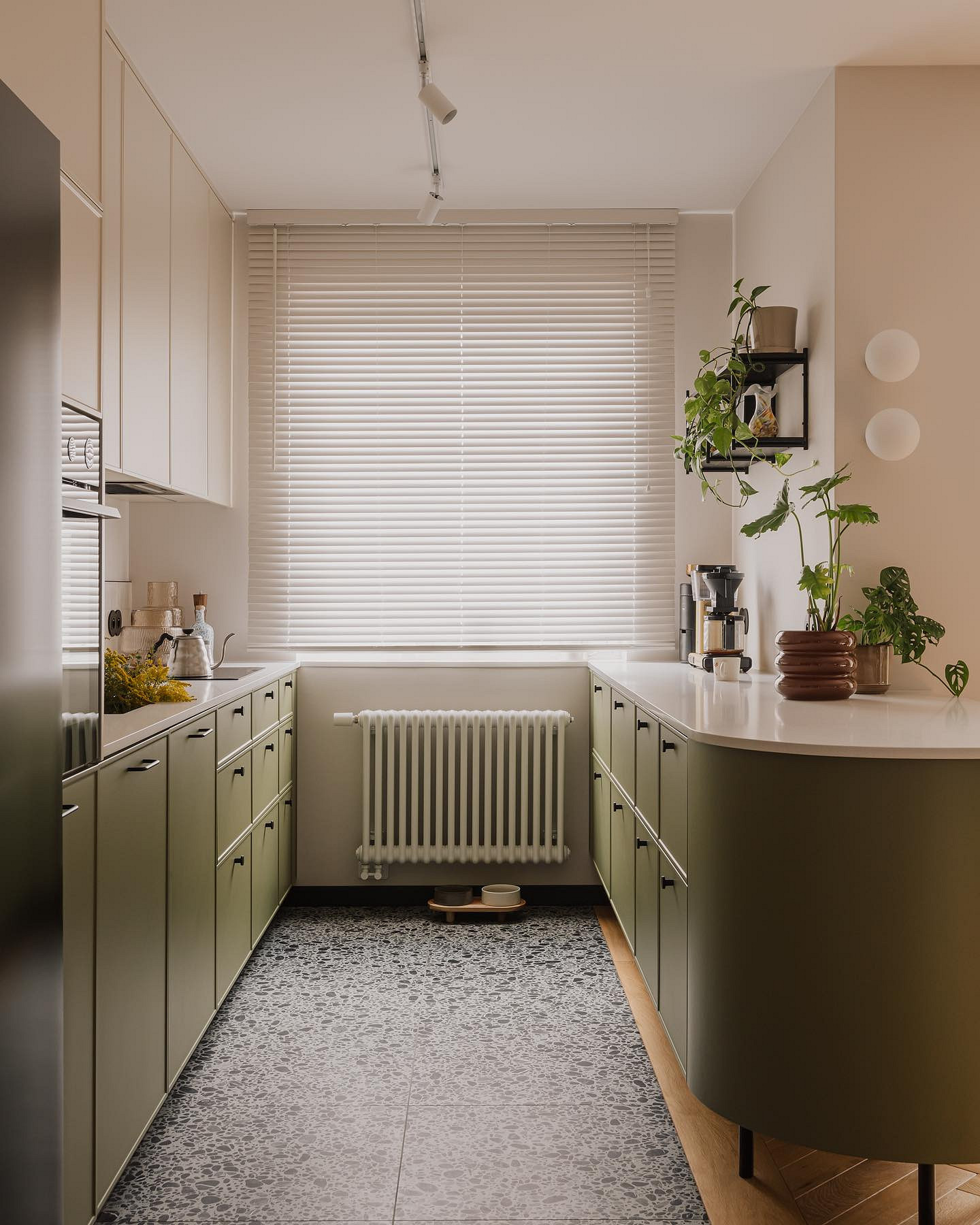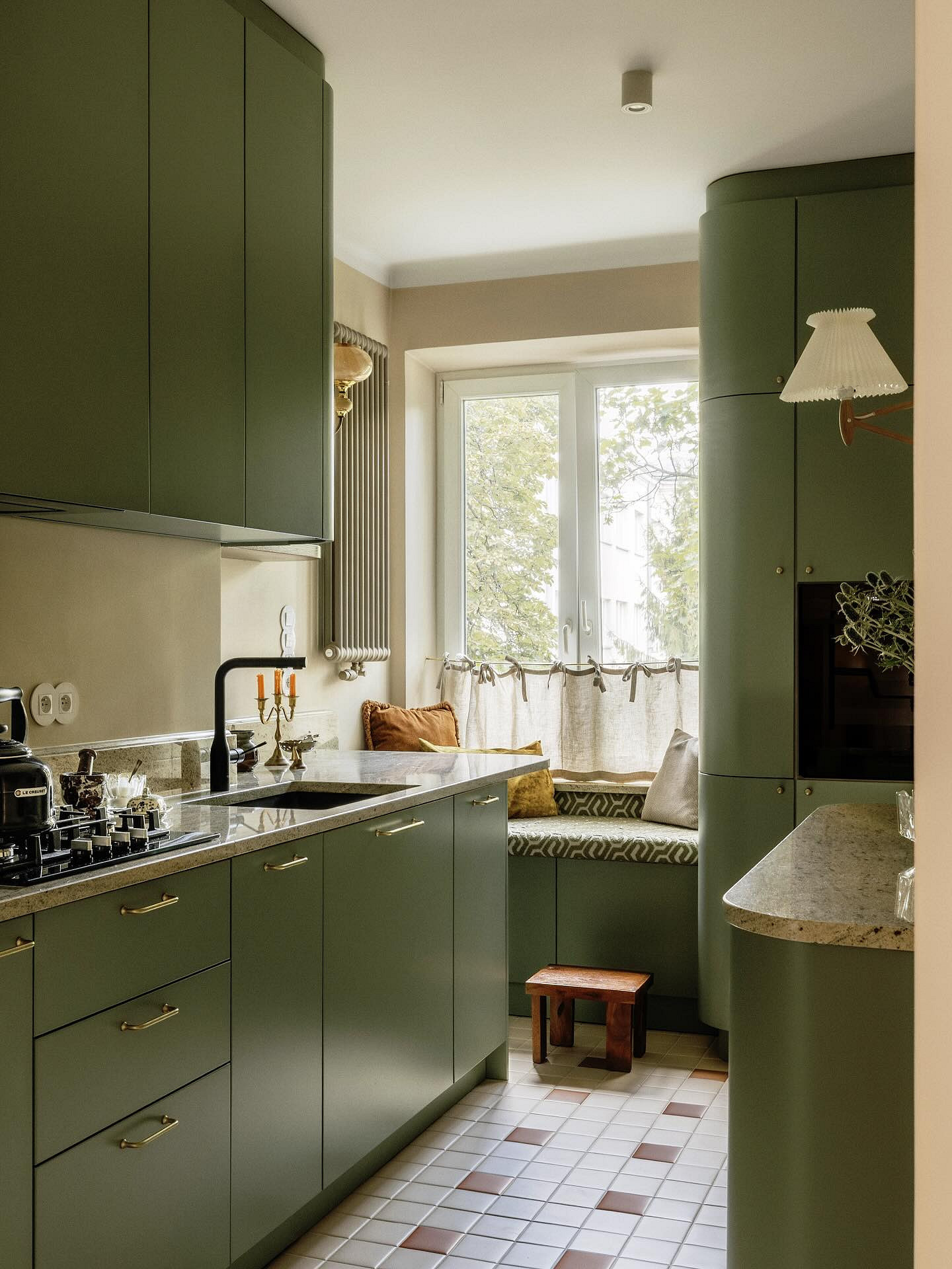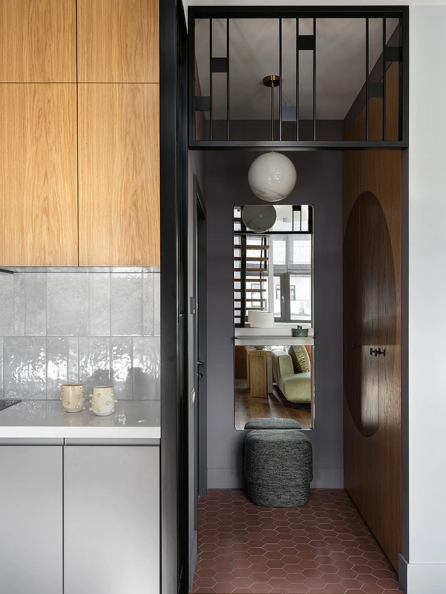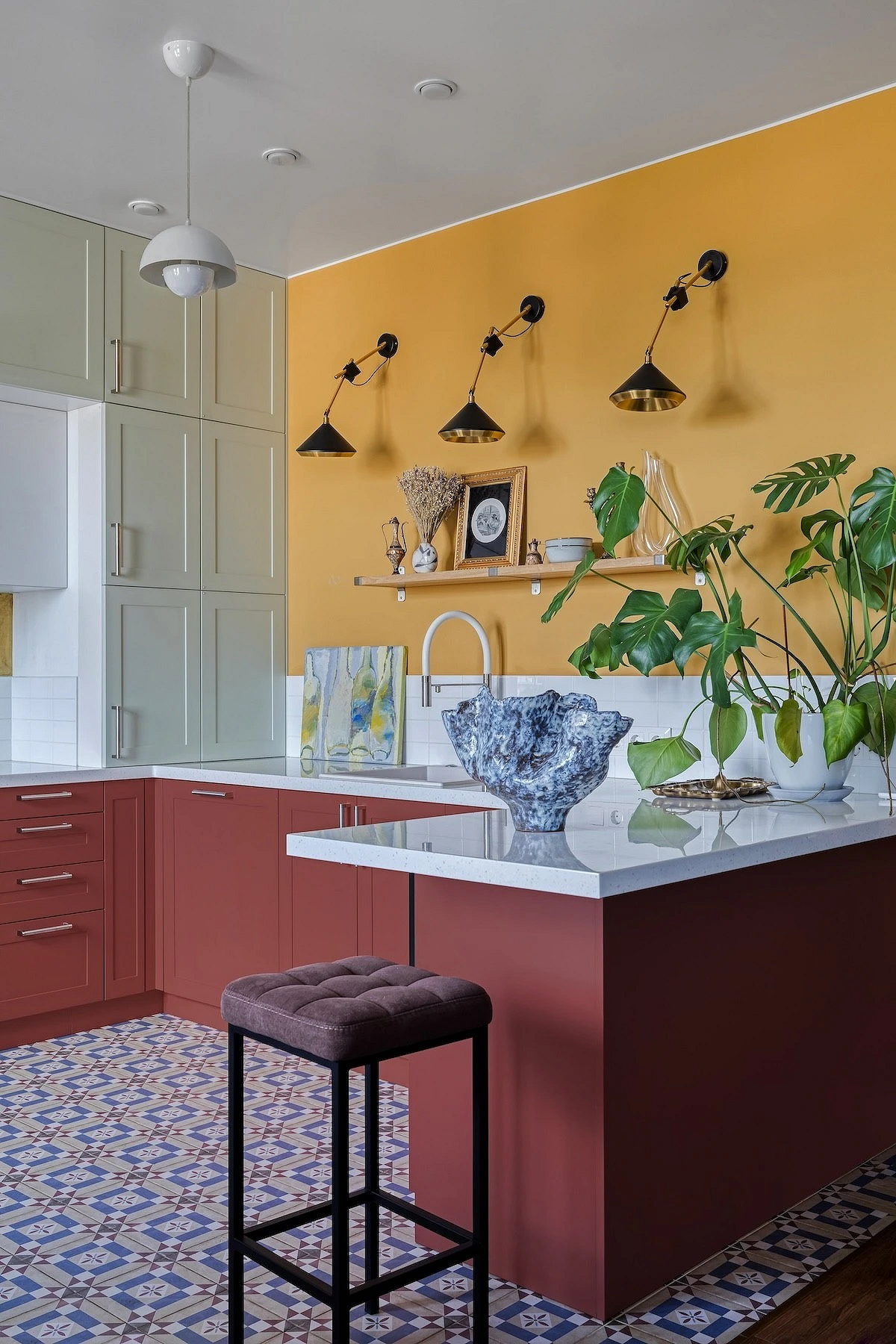 Винтажные мотивы можно встретить в 2026-м в дизайне плитки на кухне, в ванной или входной зоне. Такой пол становится выразительным акцентом, поэтому лучше всего окружить его нейтральными отделкой и мебелью, а ретротему поддержать отдельными предметами.