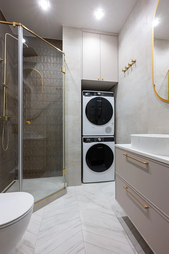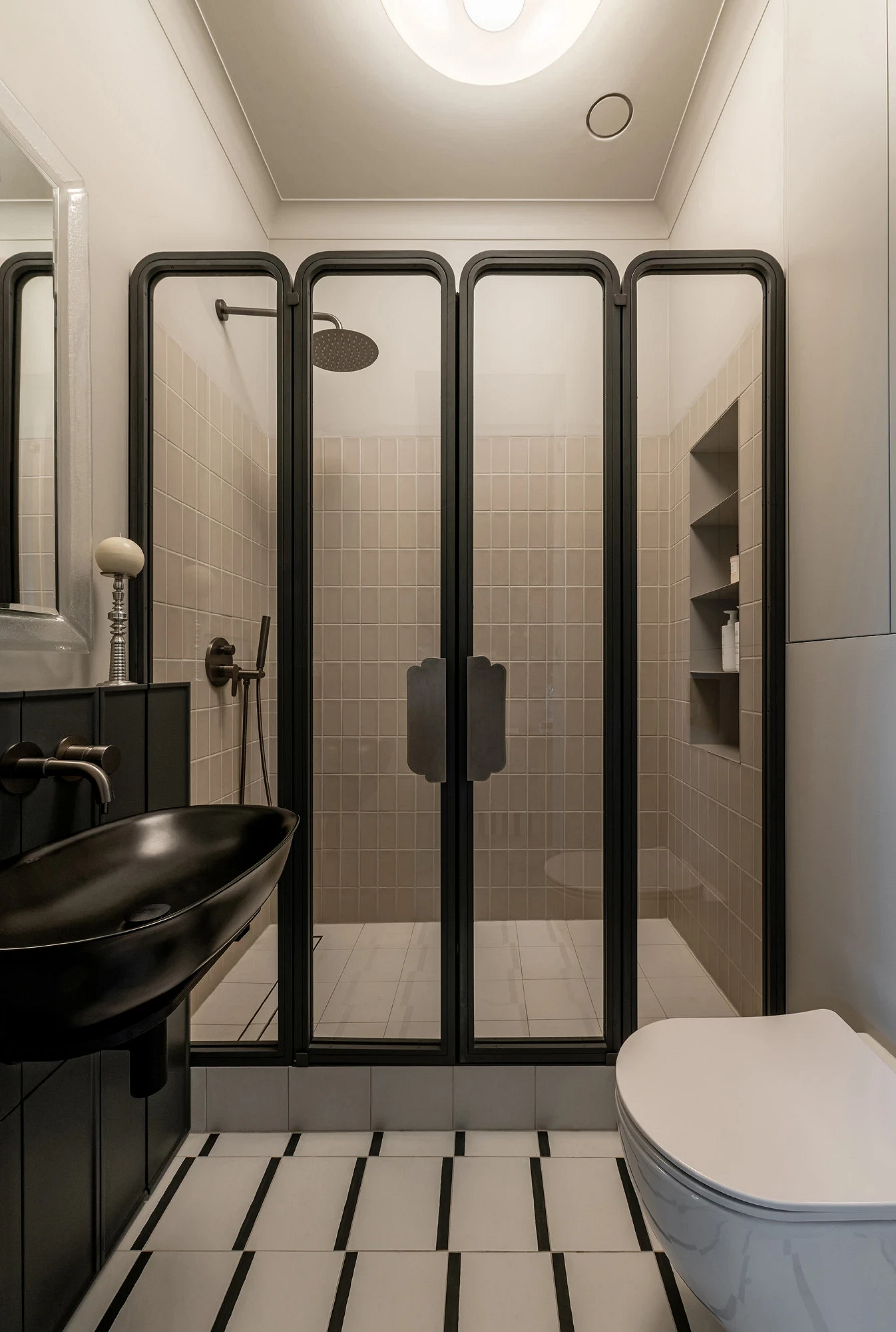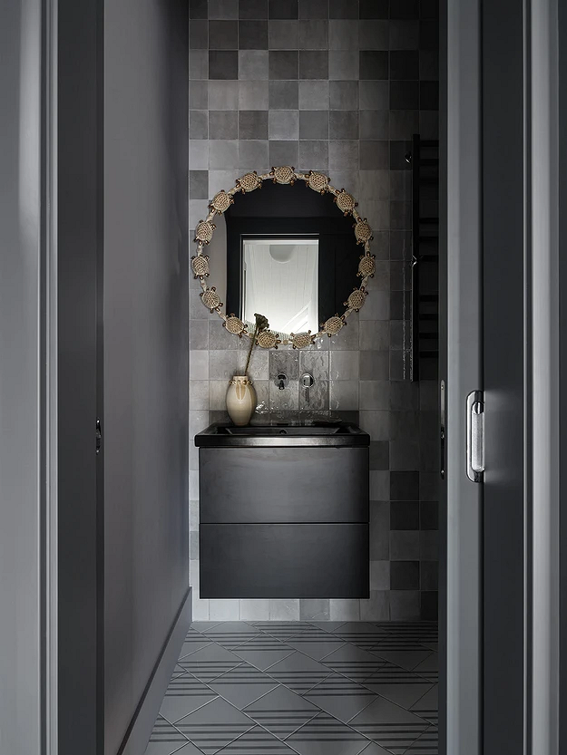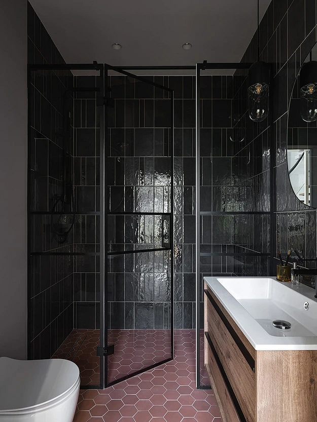 Вне времени остается классическая база. Белая, серая и бежевая плитка по-прежнему востребованы благодаря своей универсальности. Светлые оттенки визуально расширяют пространство и делают его легче. Черный цвет для пола обычно используют в сочетании с более светлой отделкой, мебелью или стенами — так он выглядит выразительно, но не утяжеляет интерьер.
