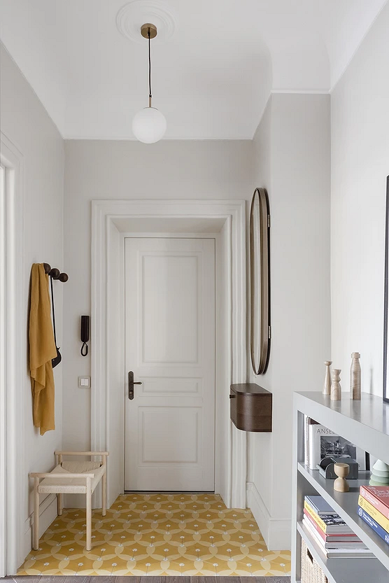 Такую плитку в основном применяют локально: например, для зонирования прихожей или кухни-гостиной или в маленьком помещении. Геометрия хорошо сочетается с черно-белой палитрой и однотонной отделкой стен. Если же вы делаете яркий пол, поддержите его цвет в небольших деталях.