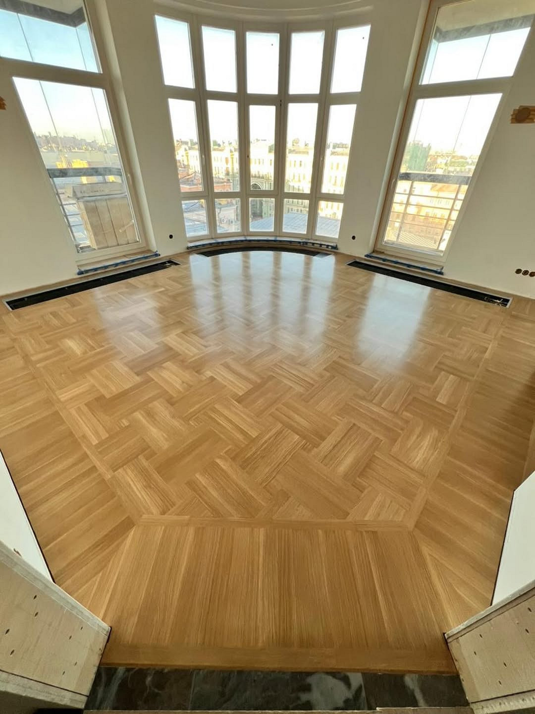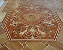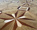 Наиболее изысканный вид художественного паркета называется дворцовым. Его отличает многообразие и сложность форм, богатая палитра и уникальная композиция. Такое покрытие создают по индивидуальным заказам, поэтому в рисунке можно реализовать любые идеи.