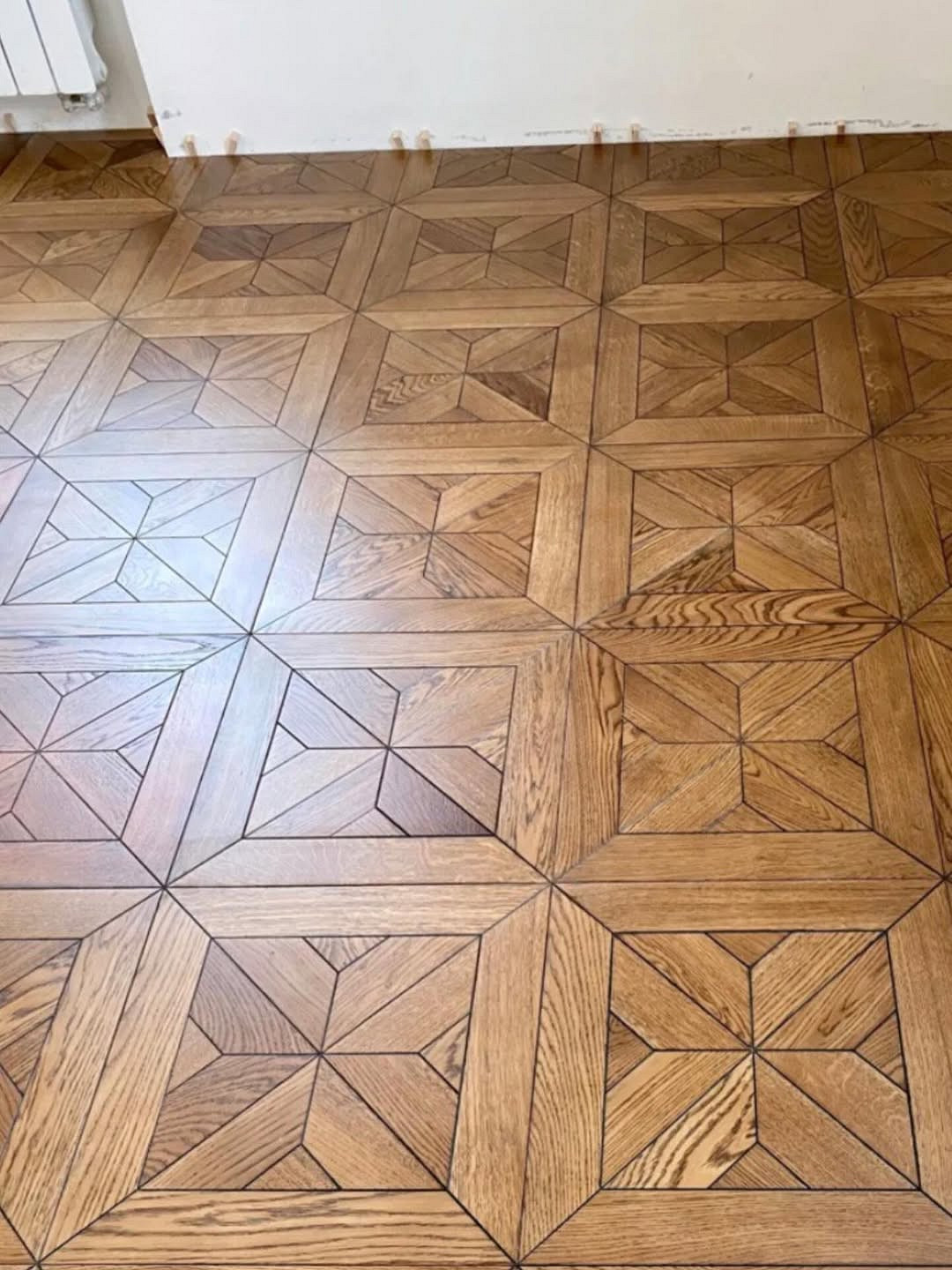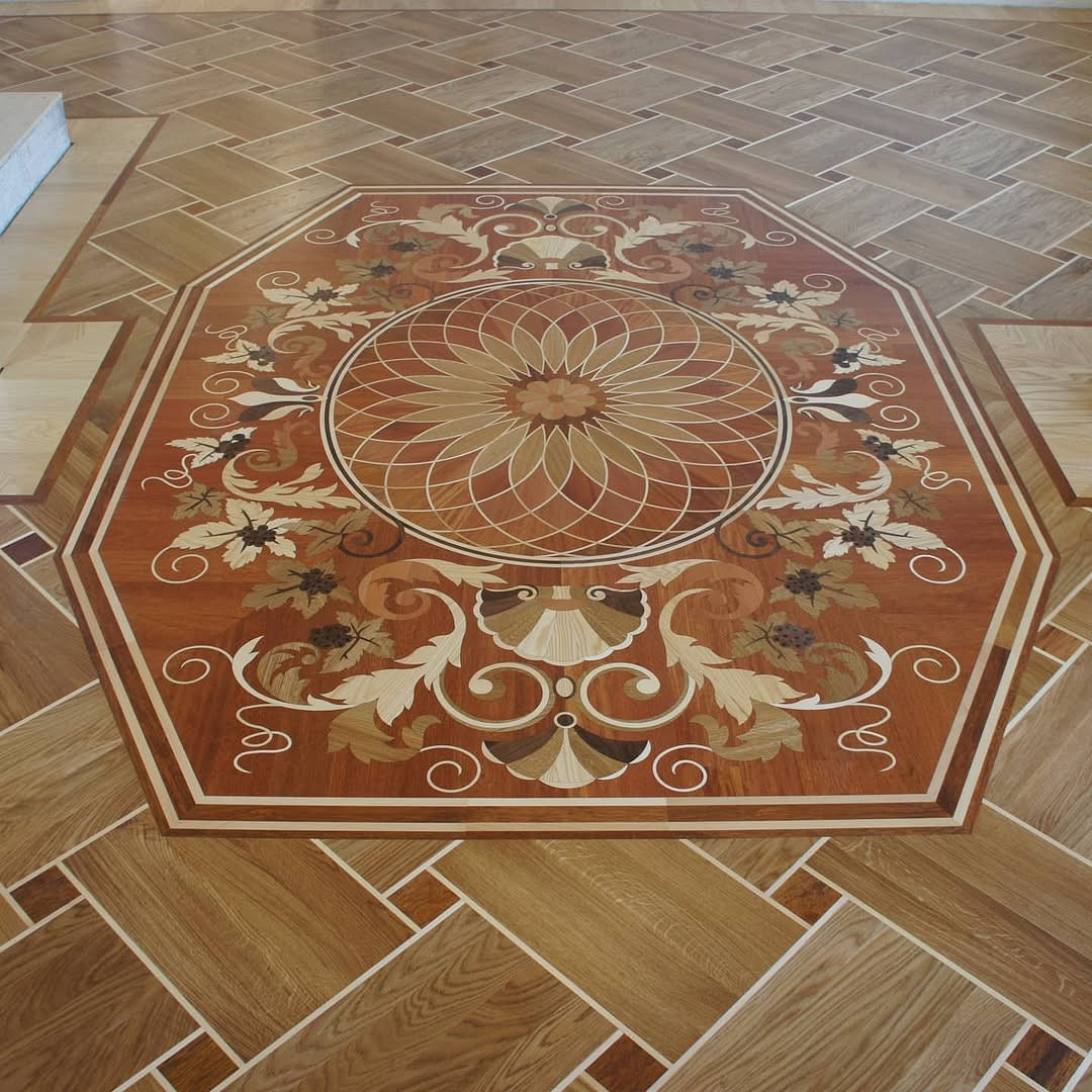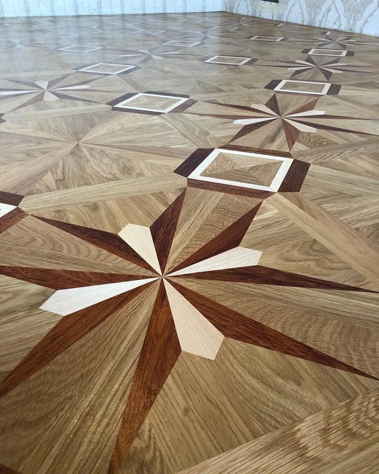 Это самый дорогой вид паркета для пола. После укладки он представляет собой сложные картины из замысловатых узоров. Чтобы рисунок был хорошо виден, для такого покрытия применяют древесину разных, часто контрастных, оттенков.