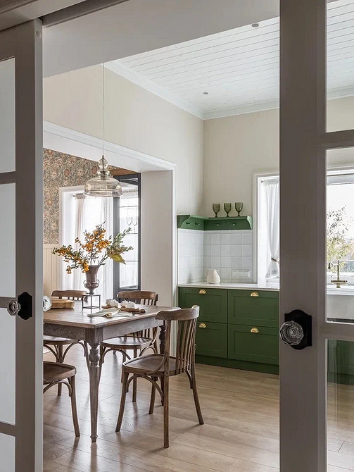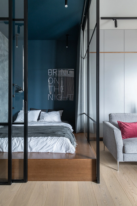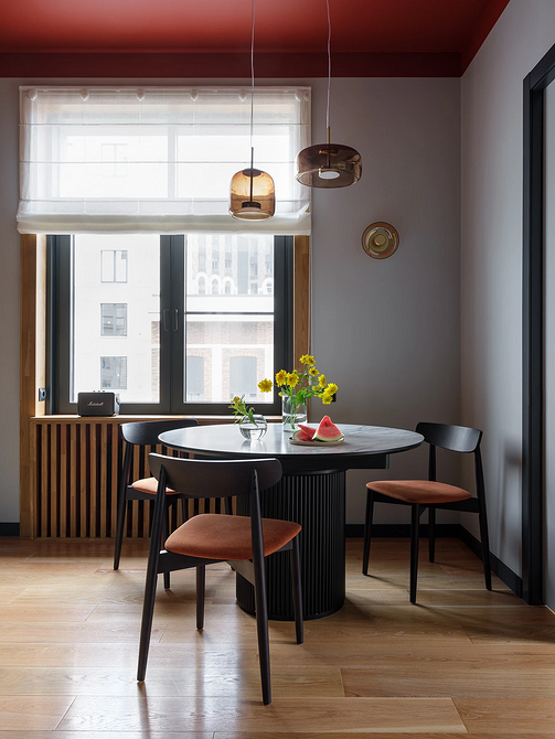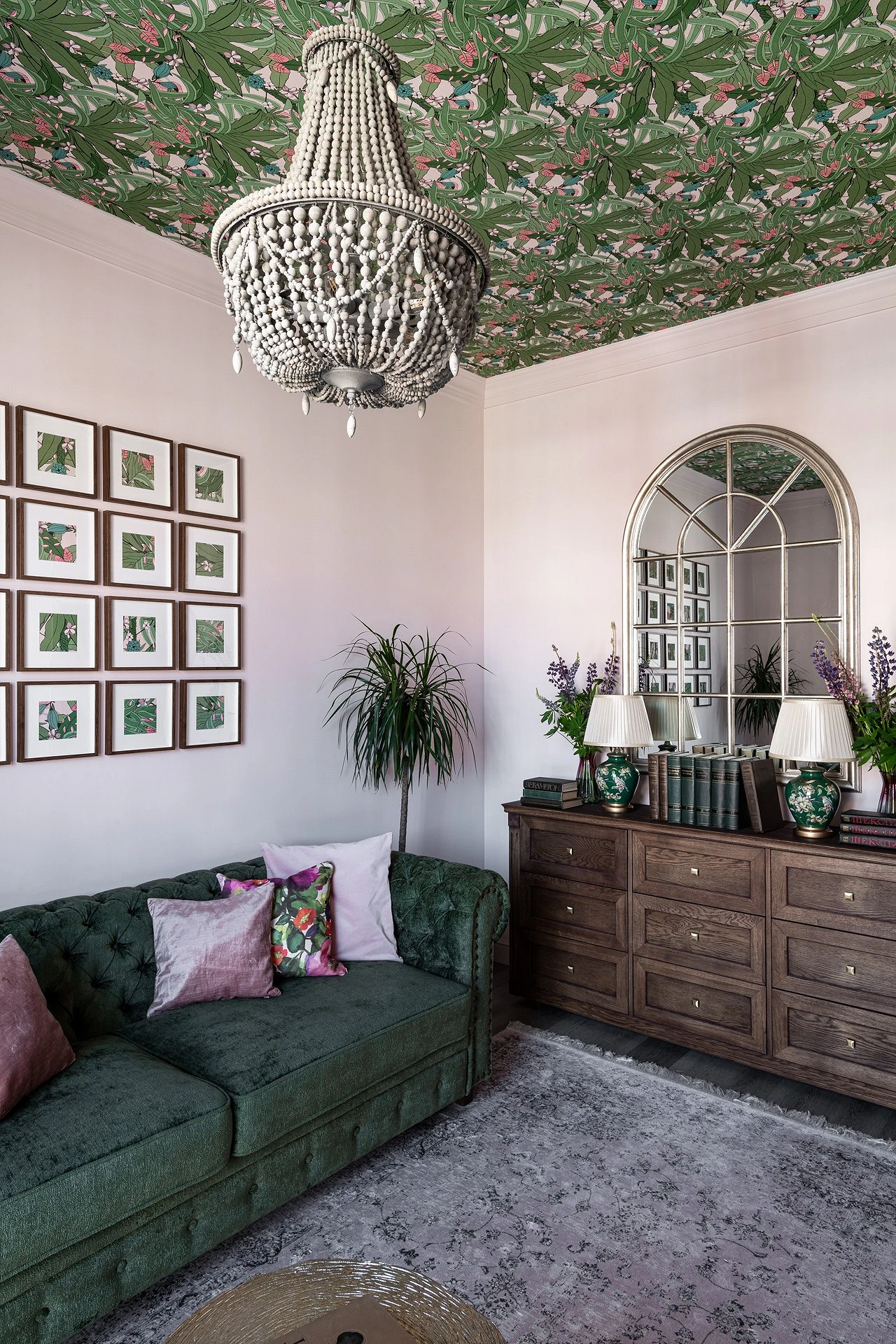 Еще один нестандартный вариант отделки — выделить в комнате зону и оформить в ней одинаковыми обоями стены и потолок: например, так сделали в этом проекте Виктории Вишневской. Смотрится свежо и помогает зонировать пространство.