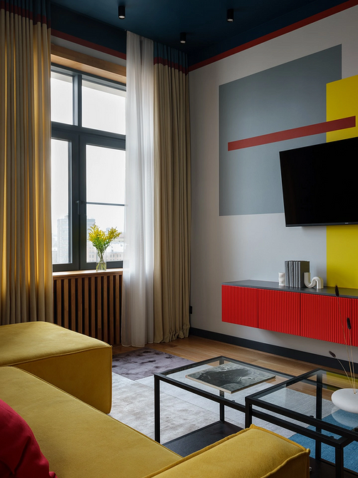 Как правило, потолочные карнизы делают в тон потолка. Но есть еще один прием, который подчеркнет нестандартный цвет, — немного зайти им на стены.