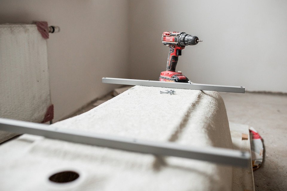 - Соберите ванну на каркасе и поставьте на место, но пока не фиксируйте. Отрегулируйте по уровню положение бортиков, убедитесь, что ножки стоят ровно.