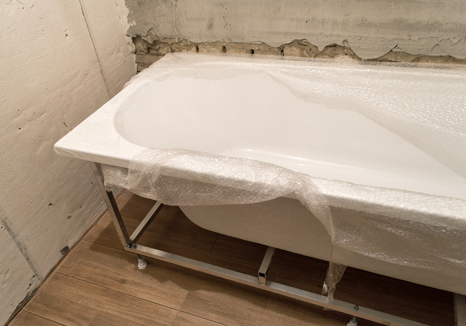 Как правильно установить ванну к стене — вначале облицевать комнату плиткой или монтировать сантехнику до чистовой отделки? Ответ зависит от материала чаши.