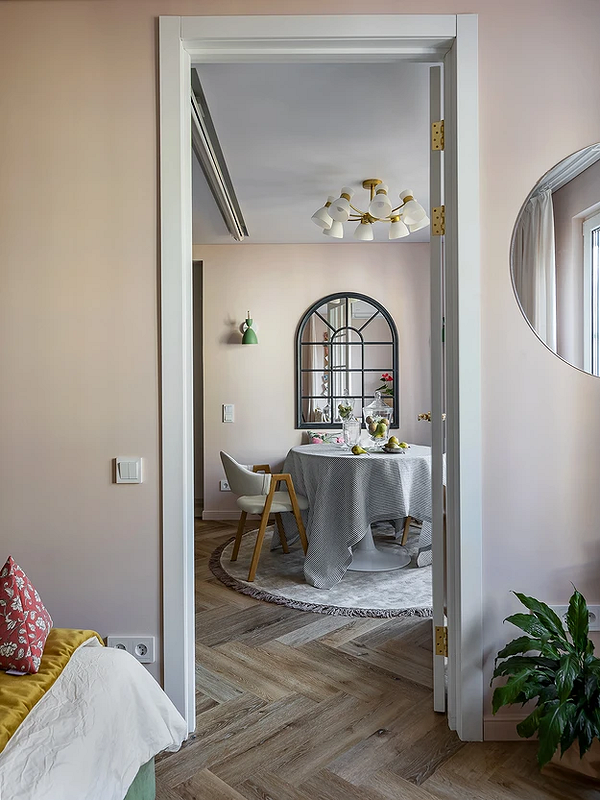Забудьте о детских ассоциациях: бледный пудрово-розовый — это сложный, припыленный и очень взрослый оттенок. На стенах он работает как белый, будучи светлым и деликатным, но за счет бежевого подтона кажется теплее и уютнее. В гостиной или спальне такой цвет создает атмосферу мягкого комфорта и гостеприимства. Сочетать его можно как с яркими акцентами, так и с базой: серым или белым, фактурой дерева.