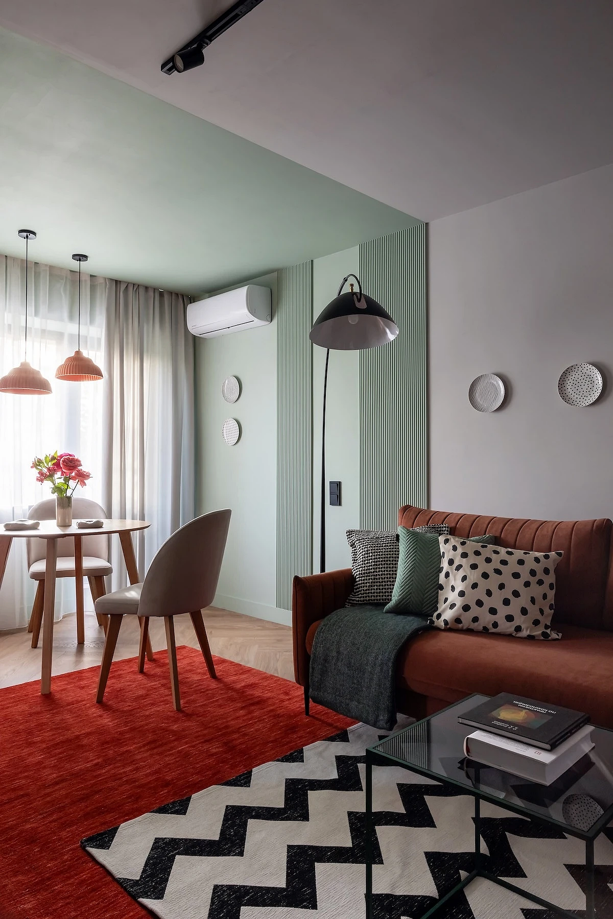 Ограничьтесь двумя, максимум тремя базовым цветами для отделки стен. Если хотите выделить часть комнаты более ярким оттенком, придерживайтесь пропорции 70/30 или 60/40. Всегда лучше сделать нейтральный фон, а яркие акценты ввести дозированно.